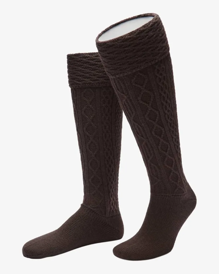 Mühlbach Trachten-Kniestrümpfe für Herren von Gottseidank in Dunkelbraun.Perfekte Begleiter zur Lederhose – Die knielangen Strümpfe aus feiner Schurwollebegeistern durch das stilvolle Strickmuster und die zeitlose Aufmachung. EinUmschlag in traditionellem Rautenmuster rundet das Modell gekonnt ab.