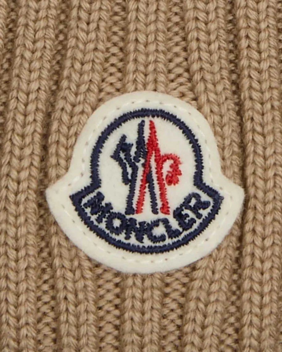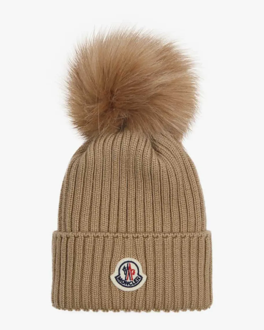 Mütze für Mädchen von Moncler Enfant in Beige. Das Modell aus angenehmerSchurwoll-Qualität avanciert durch sein zeitloses Design in Rippstrick-Aufmachung zum perfekten Begleiter. Der tonale Kunstfell-Bommel sowie dielabeltypische Logo-Applikation setzen zudem modische Akzente.