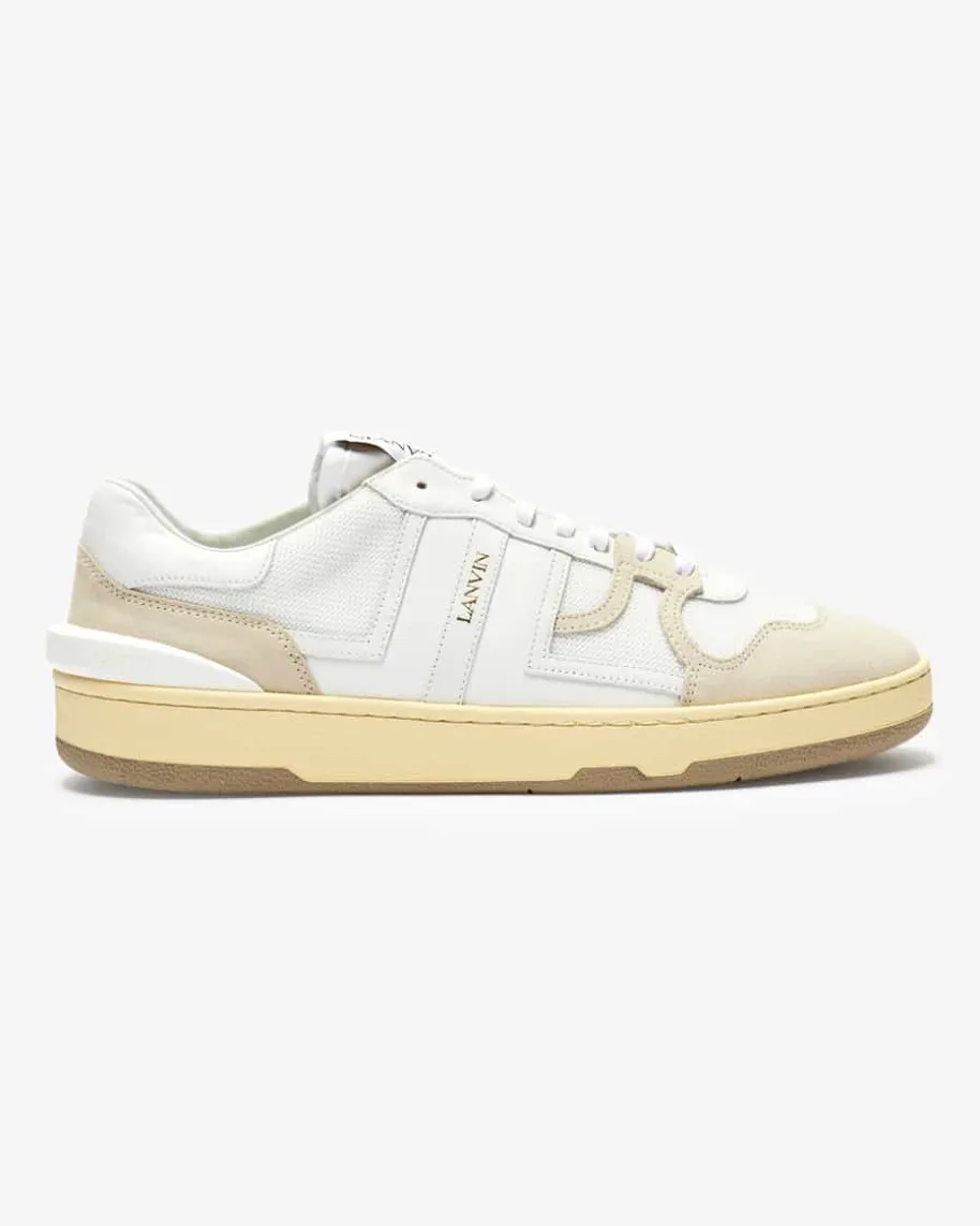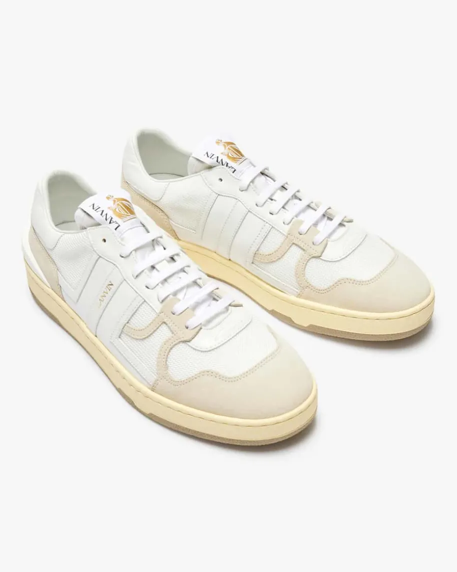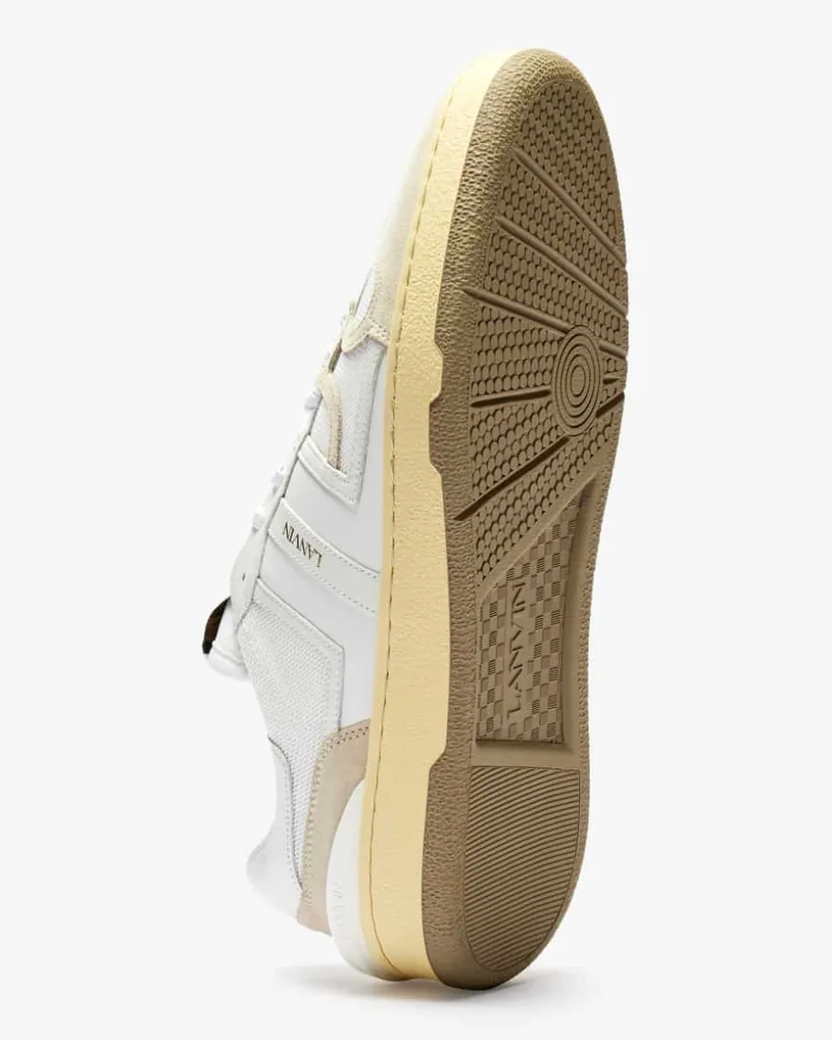 Nash Sneaker für Herren von Lanvin in Weiß und Beige. Dieses Modell präsentiertsich mit raffiniertem Material-Mix aus Glatt-, Veloursleder sowie Mesh undavanciert dank goldfarbenen Logo-Details zum sportiven Must-Have.