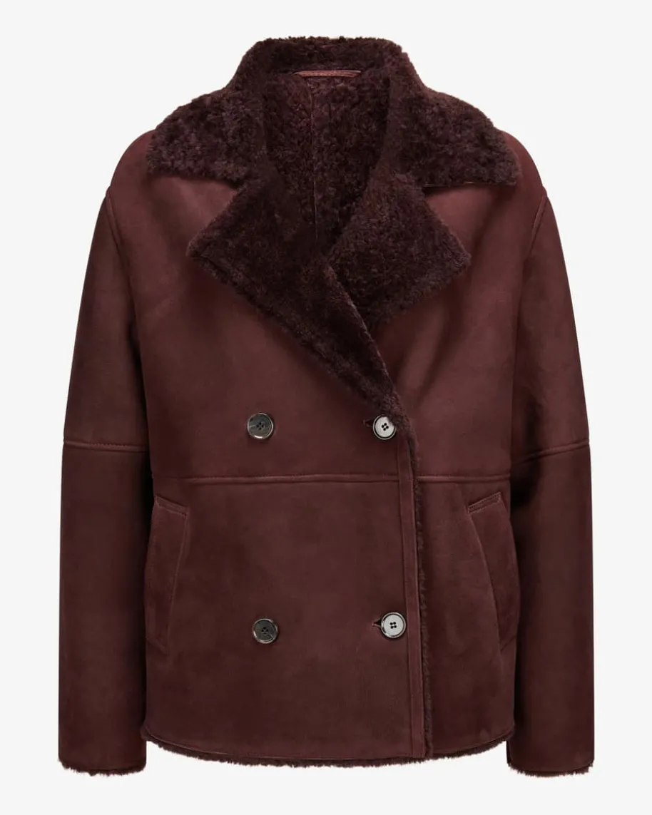 Nassua Schaffelljacke für Damen von Arma in Bordeaux. Das Label ist ein Synonymfür exquisite und zeitlose Lederbekleidung. Das Modell zeichnet sich durch dieVerwendung von hochwertigem Schafvelours aus, während die Fell-Innenseite mitseiner weichen und wärmenden Eigenschaft optisch sowie haptisch punktet.Zugleich verleiht die zweireihige Aufmachung mit Reverskragen einen modischenBiker-Charakter.