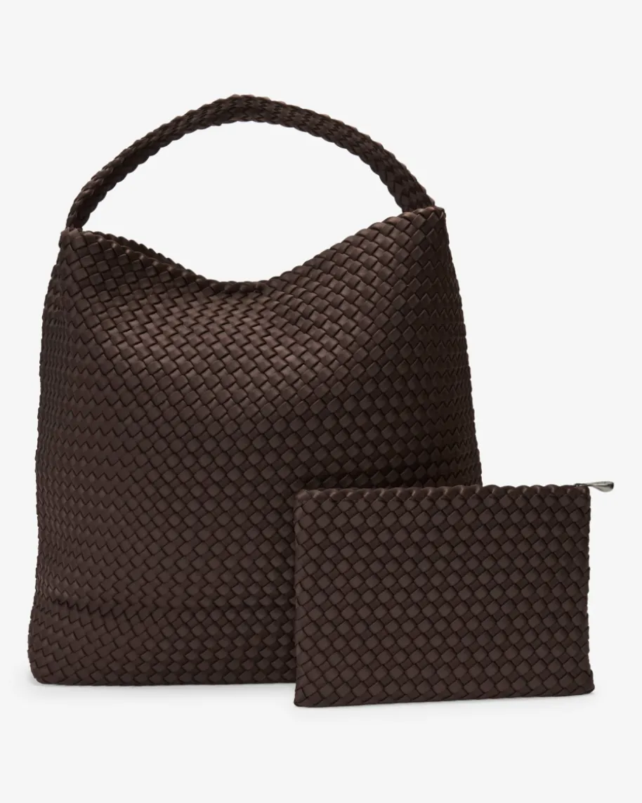 Nomad Large Hobo Henkeltasche für Damen von Naghedi in Schoko. Dieses textileModell präsentiert sich in dezent changierender Optik und edler Flecht-Aufmachung, während das XL-Design extraviel Stauraum schafft. Die separateClutch ist mit einem Reißverschluss versehen und bietet Platz für IhreKosmetikartikel oder andere Kleinigkeiten.