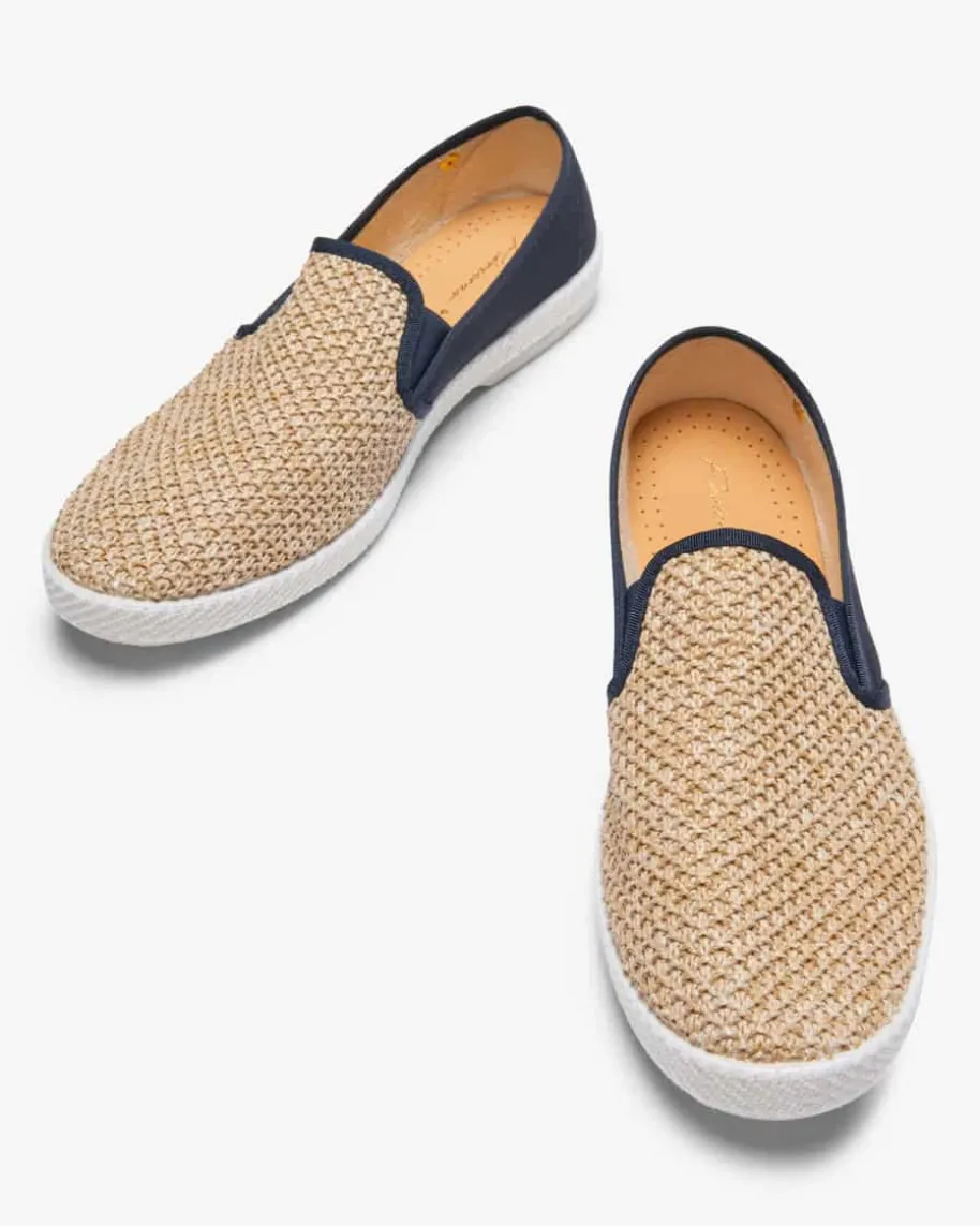 Nudude Match Slipper für Herren von Rivieras in Marine und Natur. Das Modellavanciert dank der raffinierten Kombination aus Bast und fein strukturiertemTextil zum besonderen Sommer-Begleiter, welcher durch das Frottee-Innenfutterzugleich mit hohem Tragekomfort punktet.