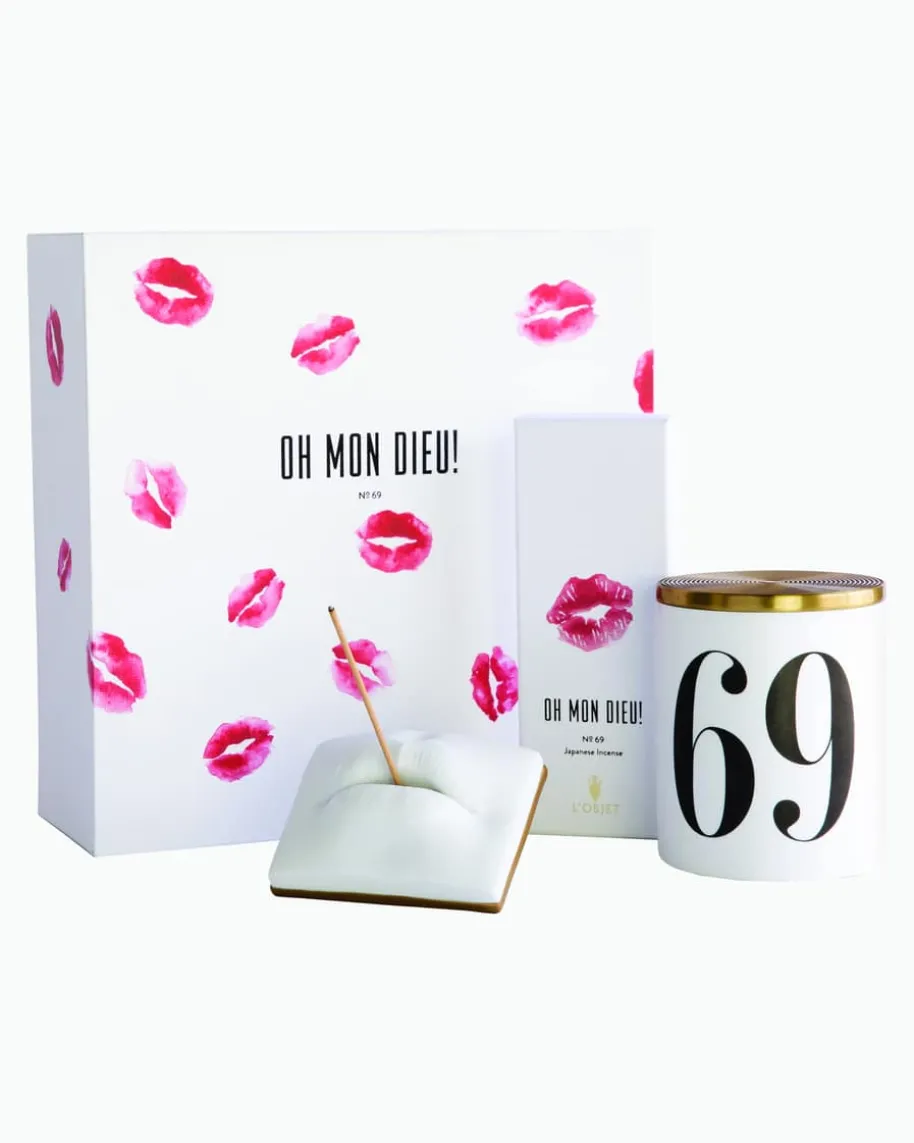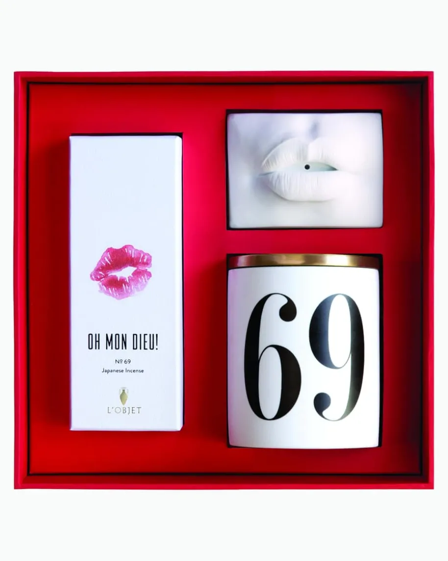 Oh Mon Dieu! No. 69 Geschenkset von L´OBJET in Weiß und Rot. Das führendeLuxushaus für Düfte und Design ist das Lebenswerk des Gründers Elad Yifrach.Durch seine globale Designperspektive wird jedem Produkt seine eigene Geschichteverliehen. Mit diesem Set erleben Sie eine sinnliche Kombination aus Cognac undLippenstiftnoten mit Untertönen von Weihrauch, Leder und Karamell. Es enthälteine Kerze in einem Porzellangefäß, 60 japanische Räucherstäbchen und einenRäucherstäbchenhalter aus Porzellan.