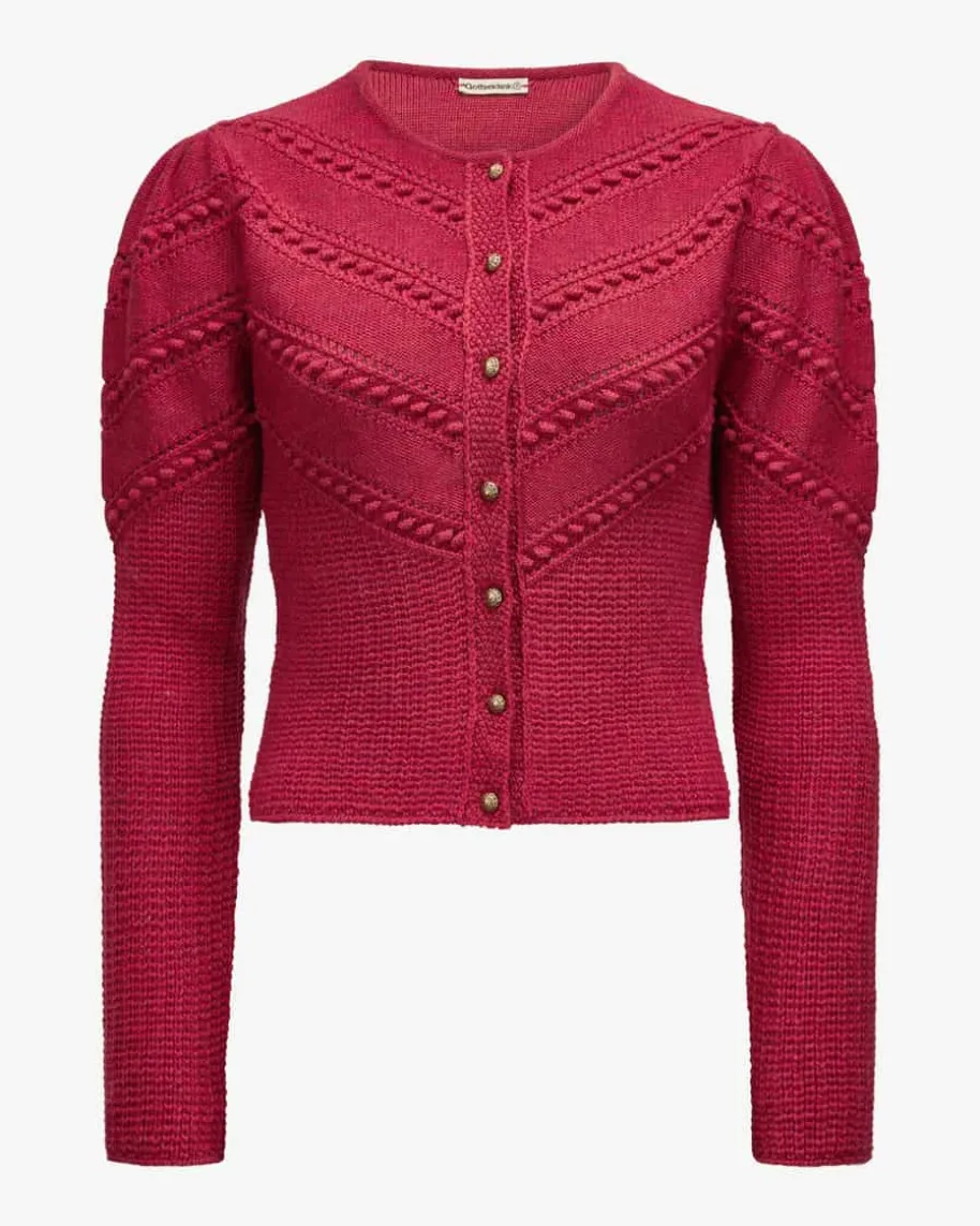 Ophelia Trachten-Strickjacke für Damen von Gottseidank in Bordeaux. Dieextrafeine Merino-Wolle in raffinierter Strick-Qualität punktet mit besondersangenehmem Tragekomfort, während stilvolle Kugelknöpfe sowie die Raffungen anden Schultern das traditionelle Modell gekonnt vollenden.