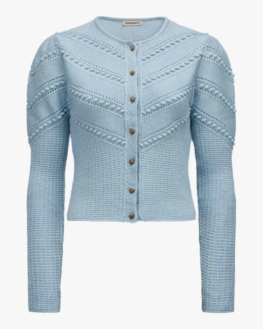 Ophelia Trachten-Strickjacke für Damen von Gottseidank in Hellblau. Dieextrafeine Merino-Wolle in raffinierter Strick-Qualität punktet mit besondersangenehmem Tragekomfort, während stilvolle Kugelknöpfe sowie die Raffungen anden Schultern das traditionelle Modell gekonnt vollenden.
