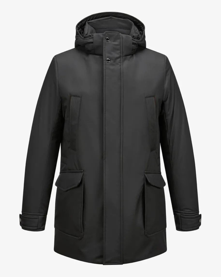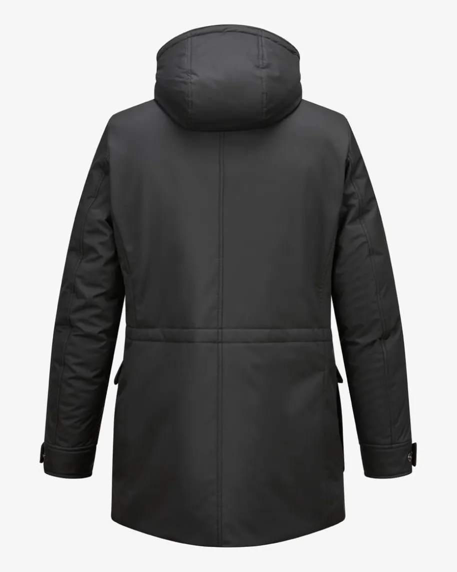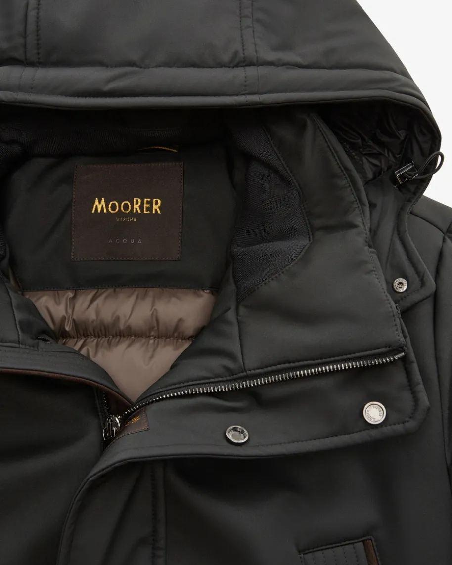 Oran Daunenparka für Herren von Moorer in Schwarz. Made in Italy – Das im NordenItaliens ansässige Label steht für hochwertige Jacken, gefertigt aus feinstenMaterialien und jedes Design steht für den klassischen Mode-Charme Italiens.Auch dieses Modell vereint maskulinen Charme mit funktionalen Eigenschaften.Während die hochwertige wärmeisolierende Daunen-Füllung optimalen Schutz vorKälte bietet, runden feine Details in Leder-Optik das Gesamtbild stilvoll ab.