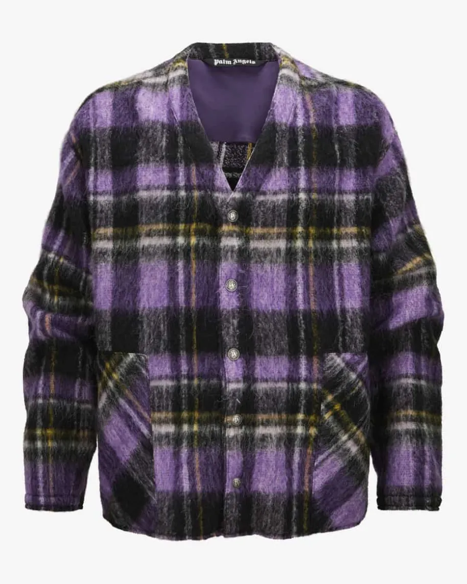 Overshirt für Herren von Palm Angels in Violett, Schwarz und Off-White. DasOversize-Modell präsentiert sich in trendiger Overshirt-Aufmachung mitgroßflächigem Karo-Muster. Die Verarbeitung aus hochwertigem Alpaka-Mohair-Woll-Mix sorgt für angenehm-weiche Haptik und rundet den legeren Style gekonnt ab.