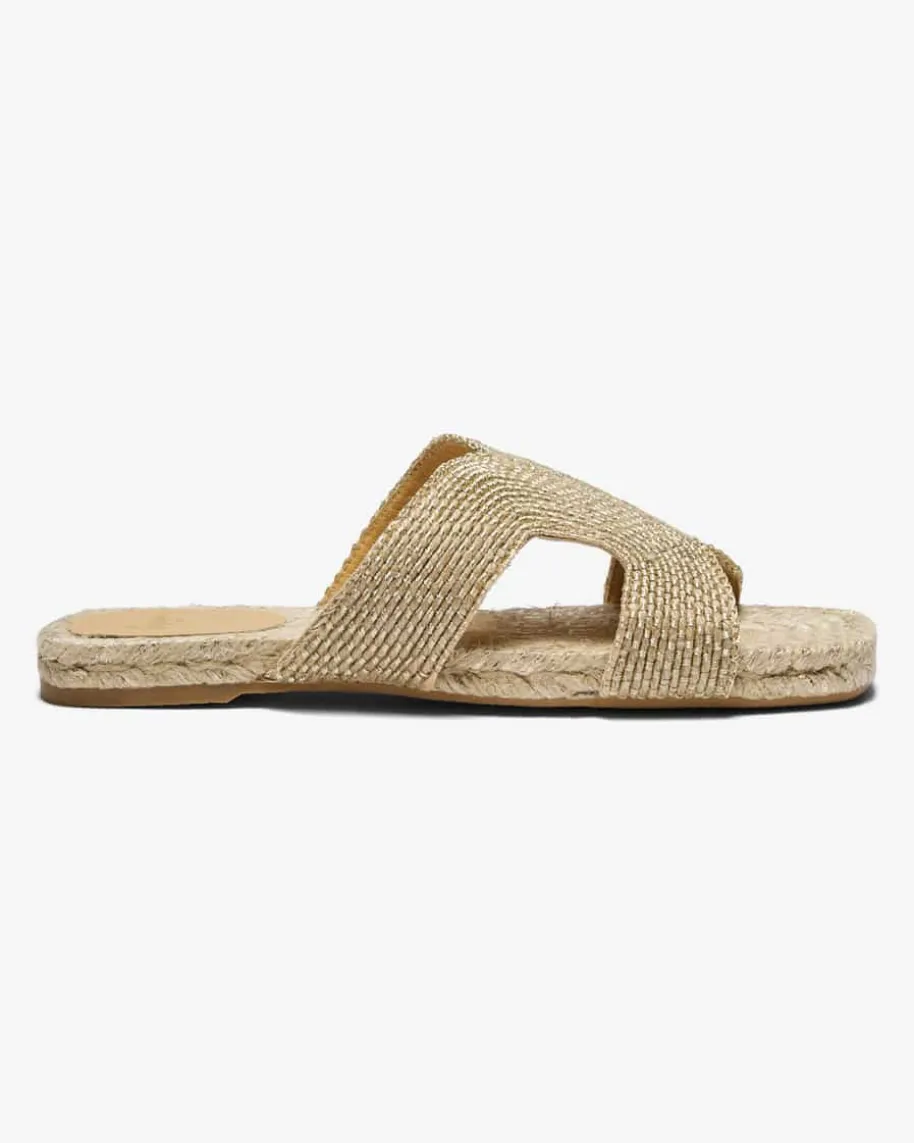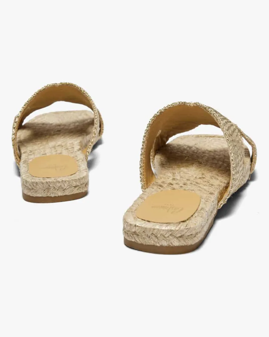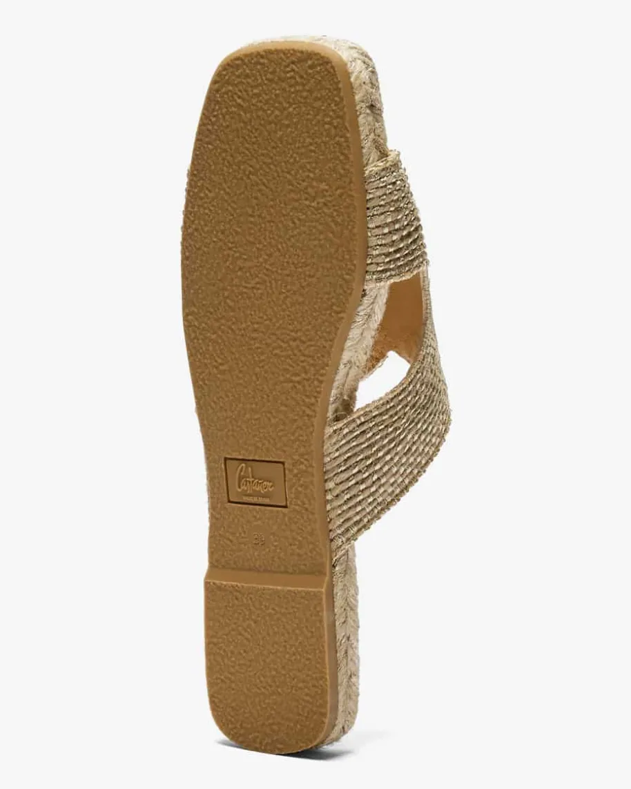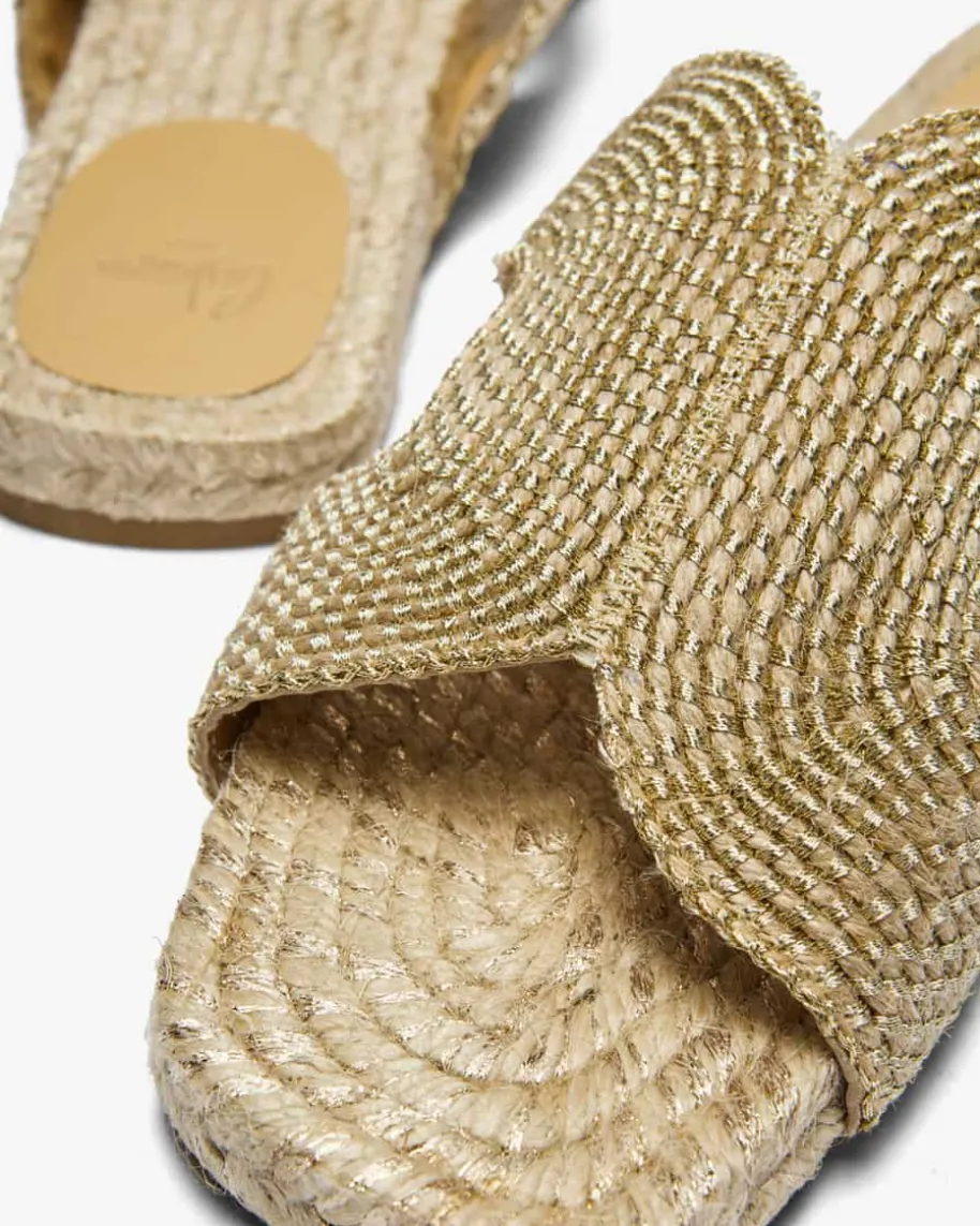Pantoletten für Damen von Castaner in Natur und Gold. Das handgefertigte Modellavanciert durch die natürliche Material-Verarbeitung mit Metallic-Elementen zueinem besonderen Hingucker im Sommer, während die flache Sohle mit geflochtenemJute-Besatz und Lurex-Fasern sowie die eckige Form für den letzten Schliffsorgen.