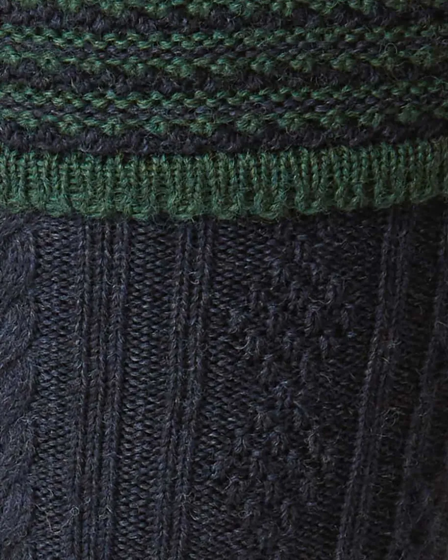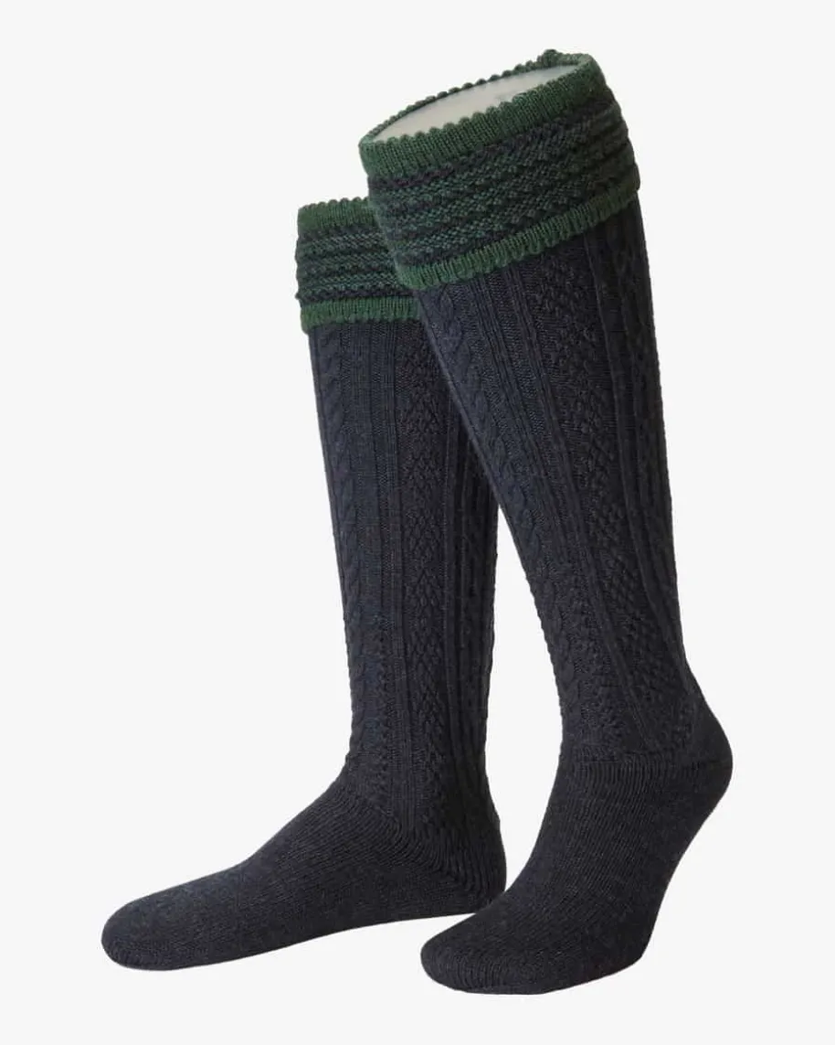 Partnach Trachten-Kniestrümpfe für Herren von Gottseidank in Nachtblau undDunkelgrün. Perfekte Begleiter zur Lederhose – Die knielangen Strümpfe ausfeiner Schurwolle begeistern durch das traditionelle Zopfmuster und die zeitloseAufmachung. Ein Umschlag in modischem Streifen-Dessin rundet das Modell gekonntab.