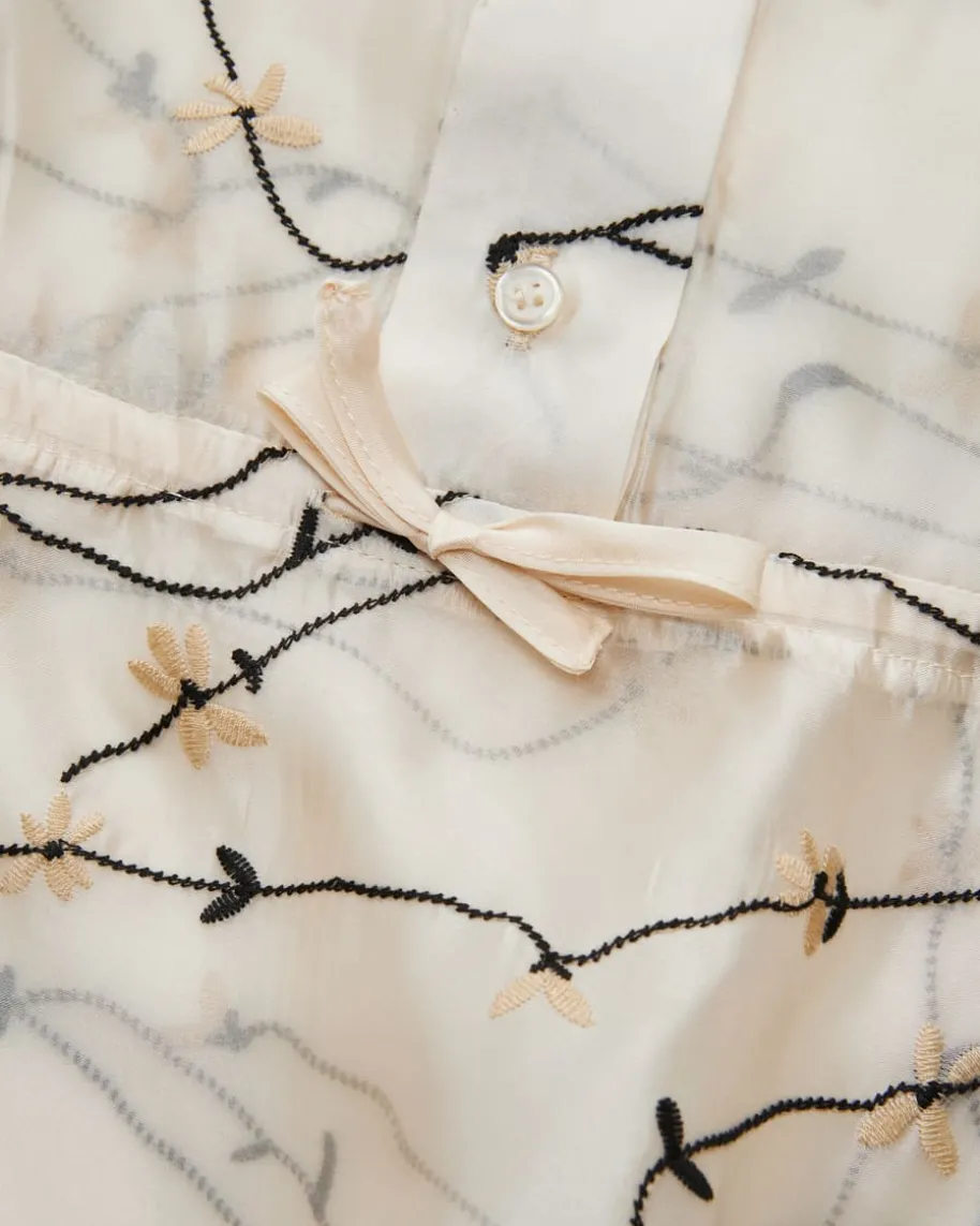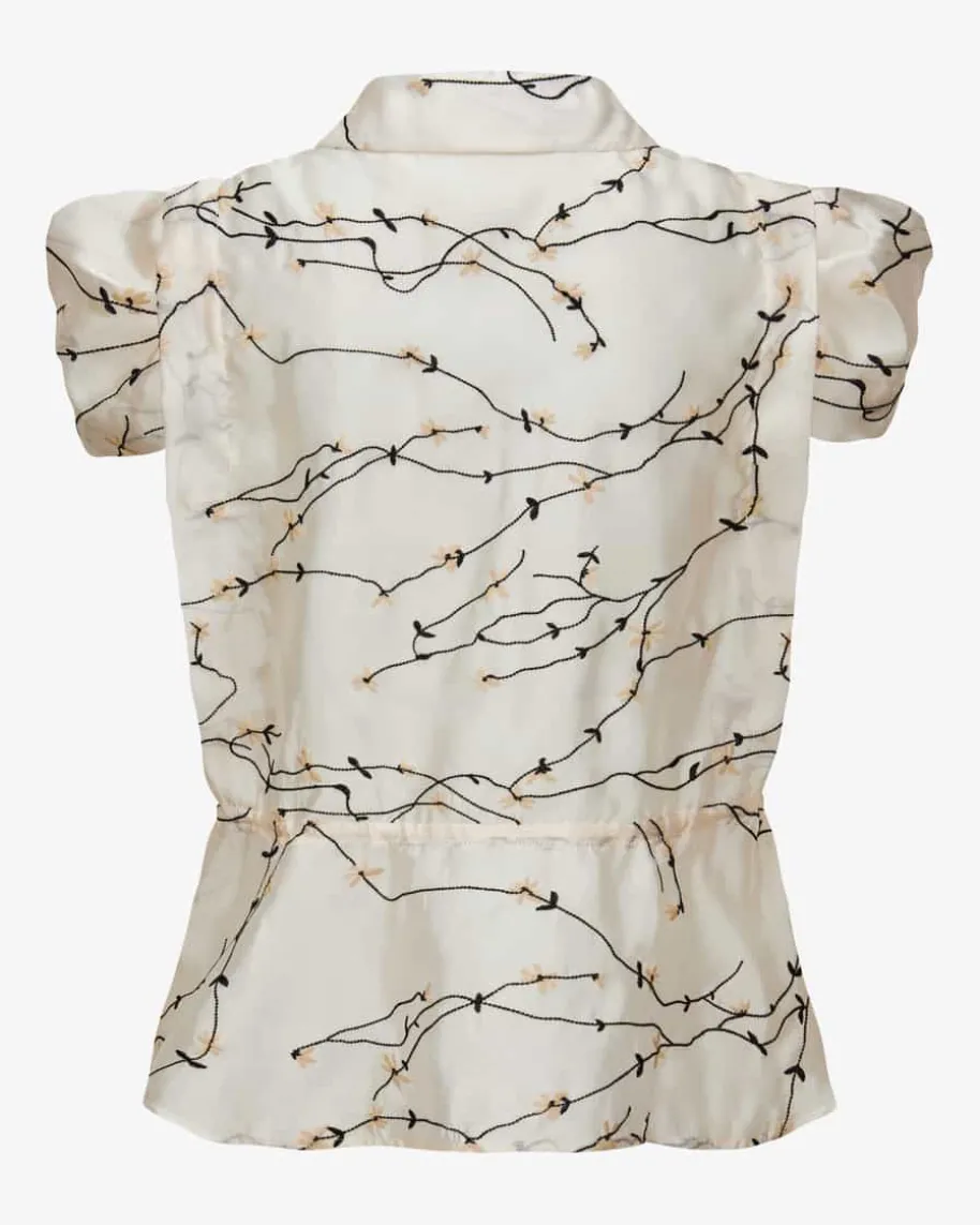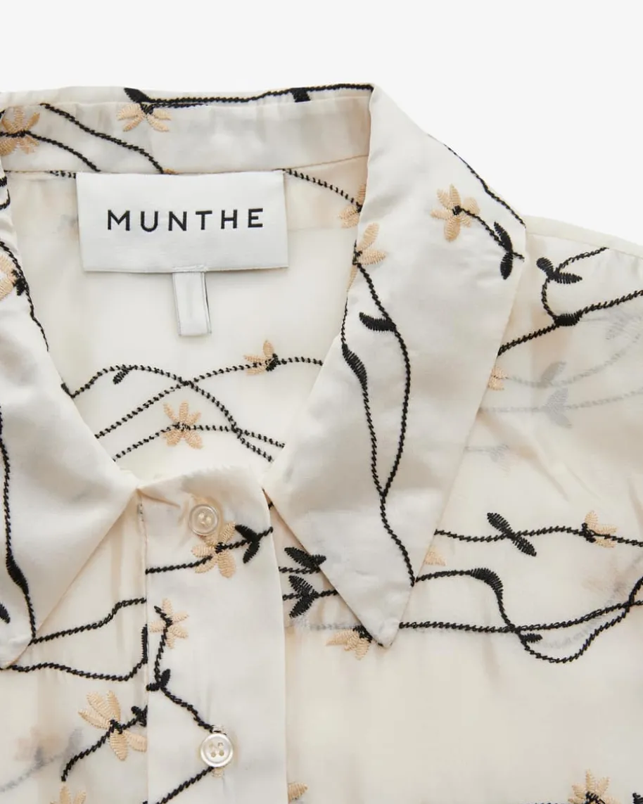 Peona Bluse für Damen von Munthe in Champagner und Schwarz. Das Model inbesonderer Schnittform überzeugt in transparenter Aufmachung, während derTunnelzug in der Taille eine feminine Silhouette schafft und die floraleStickerei das Gesamtbild edel abrundet.