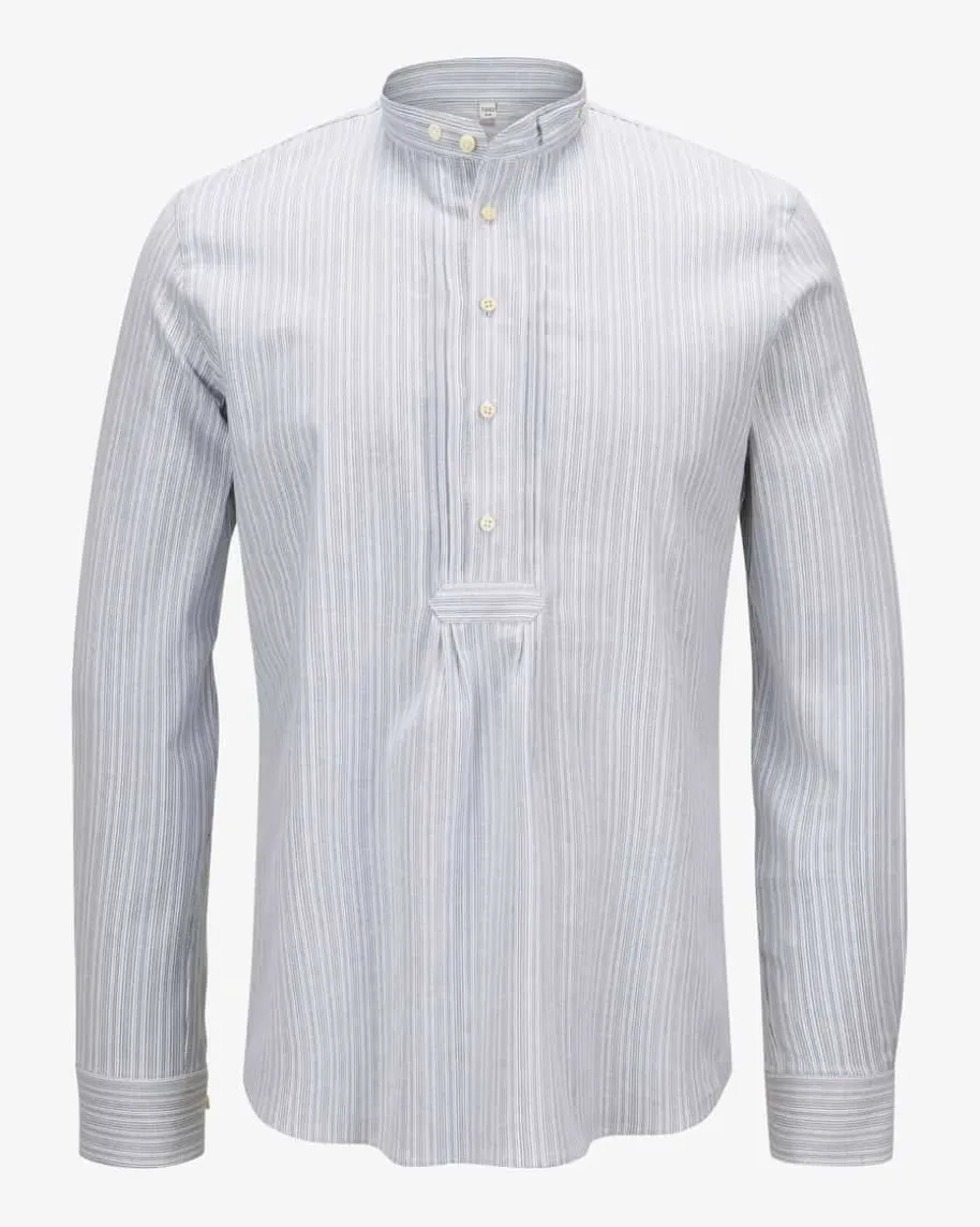 Pfoad Trachtenhemd für Herren von Gottseidank in Blau und Weiß. Das Modell intraditionellem Streifen-Dessin präsentiert sich als stilvoller Begleiter fürmodische Trachten-Looks, während klassische Details sowie Falten an derKnopfleiste das Gesamtbild charakteristisch in Szene setzen.