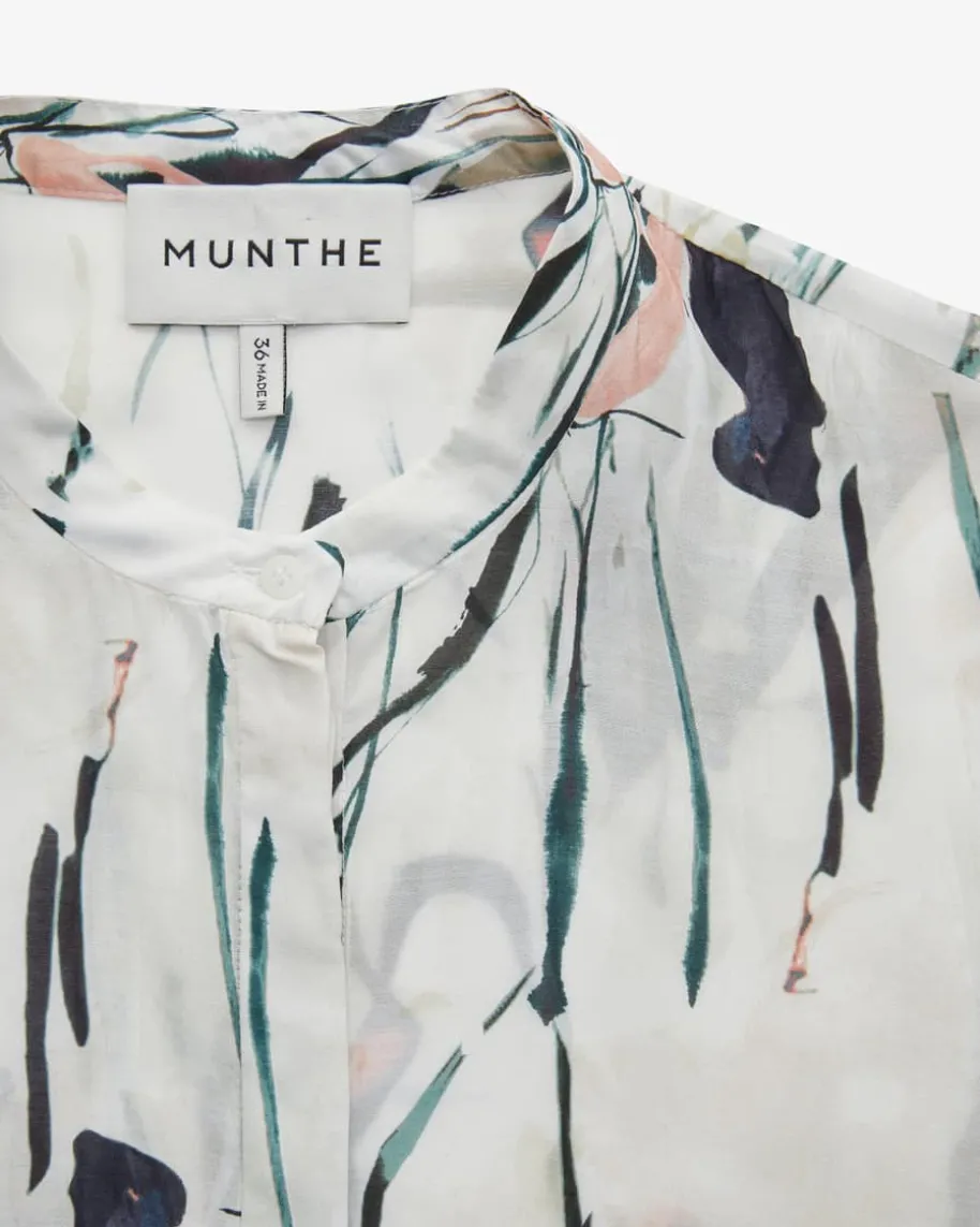 Portland Kleid für Damen von Munthe in Weiß und Bunt. Das Modell überzeugt infließend und zugleich leichter Haptik, während das farbenfrohe Dessin und dermoderne Ärmel in Ballonform das Gesamtbild gekonnt vollenden.