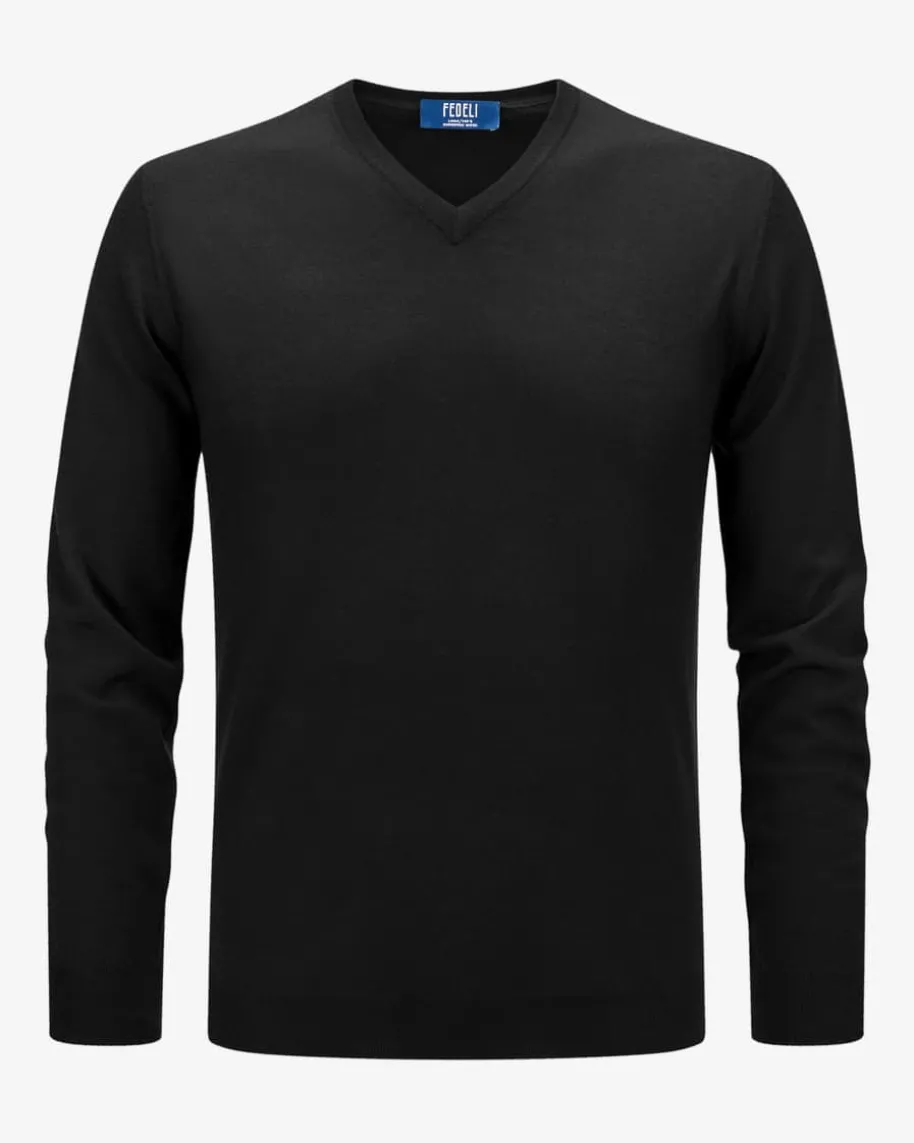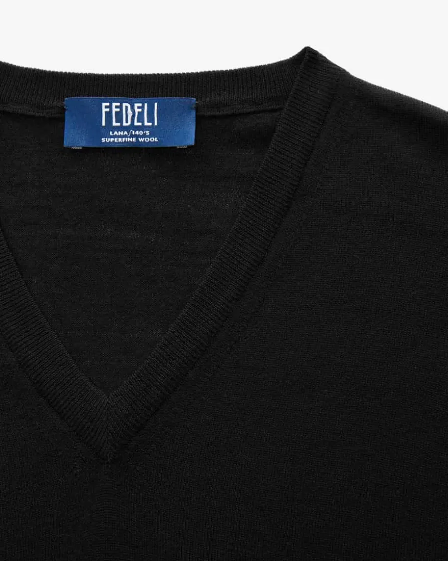 Pull M.L. Pullover für Herren von Fedeli in Schwarz. Die sehr hochwertige Super140 Schurwoll-Qualität verleiht ein besonders angenehmes Tragegefühl, währenddas cleane Design einen vielseitigen Casual-Begleiter für klassische Outfitsschafft. Zudem wird dank einer besonderen Webtechnik eine perfekte Passformgewährleistet.