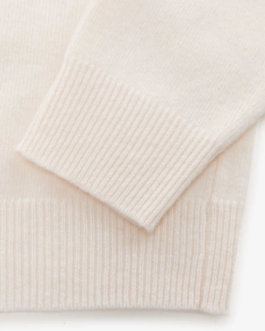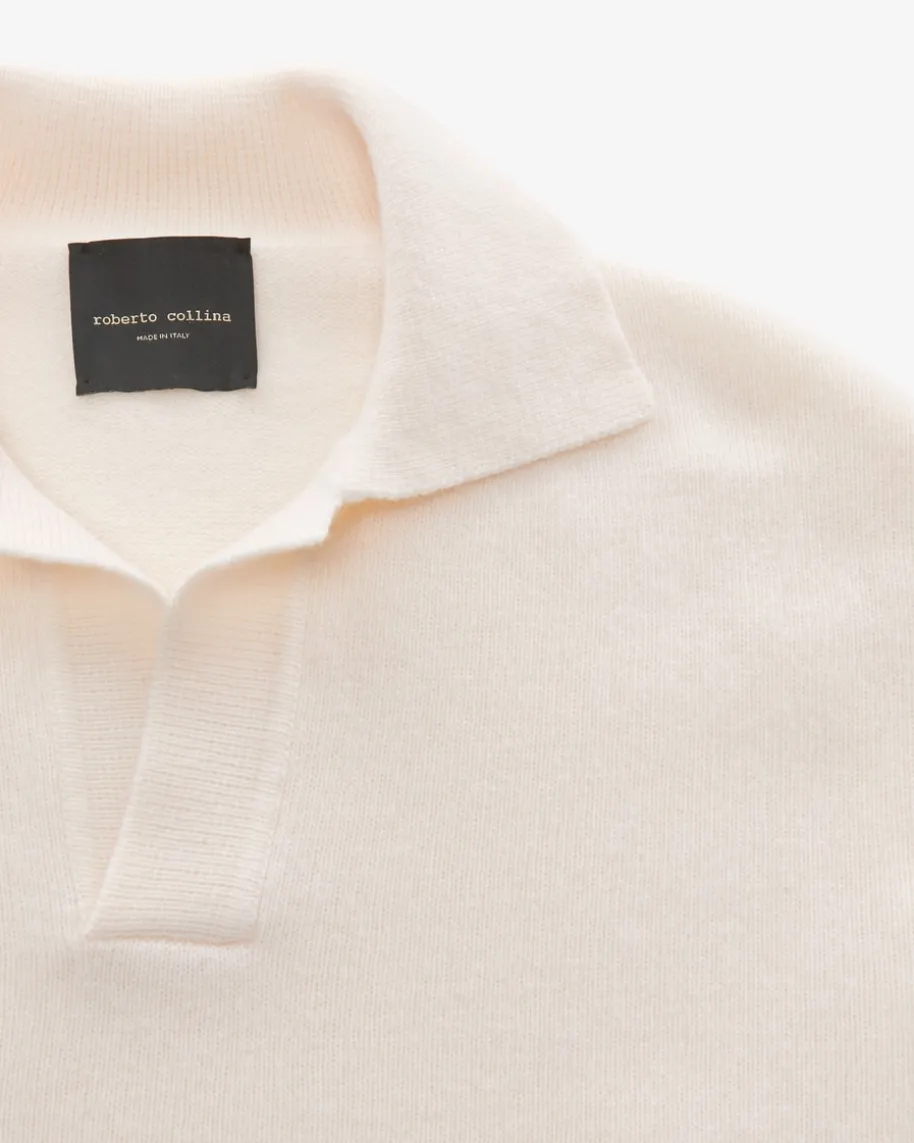 Pullover für Herren von Roberto Collina in Creme. Das weit geschnittene Modellzeichnet sich besonders durch die weiche, extrafeine Merinowoll-Qualität mitCashmere-Anteil aus, während der Variokragen ein modernes Essential mit Polo-Charakter schafft.