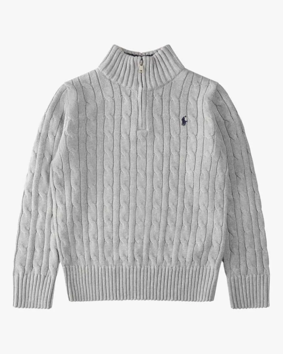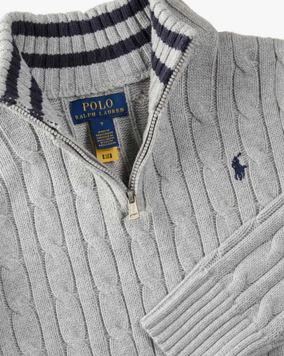 Pullover für Jungen von Polo Ralph Lauren in Grau. Eine Ikone des amerikanischenLifestyles – sportlich, preppy, klassisch. Das Modell überzeugt dank demstilvollen Zopfstrick-Muster als zeitloser Klassiker, während diekontrastierende Poloreiter-Stickerei das Design stilvoll abrundet.