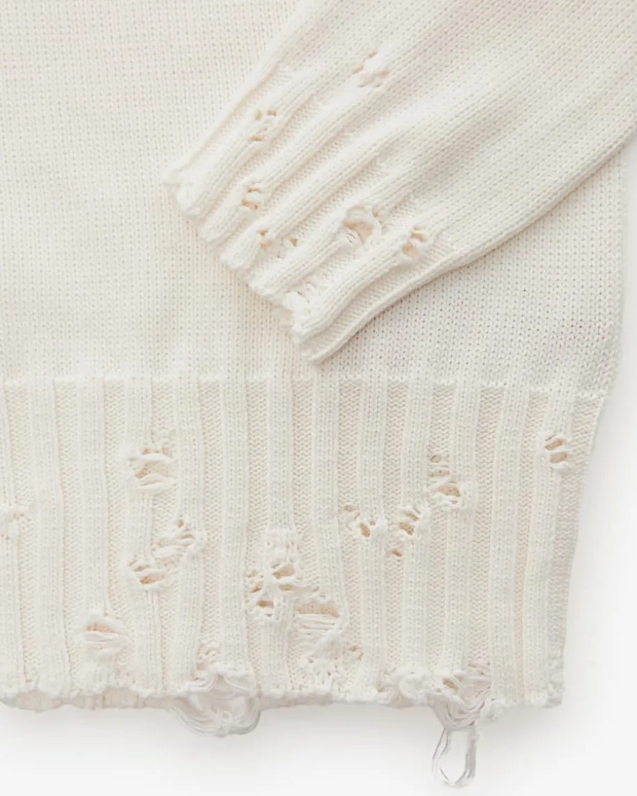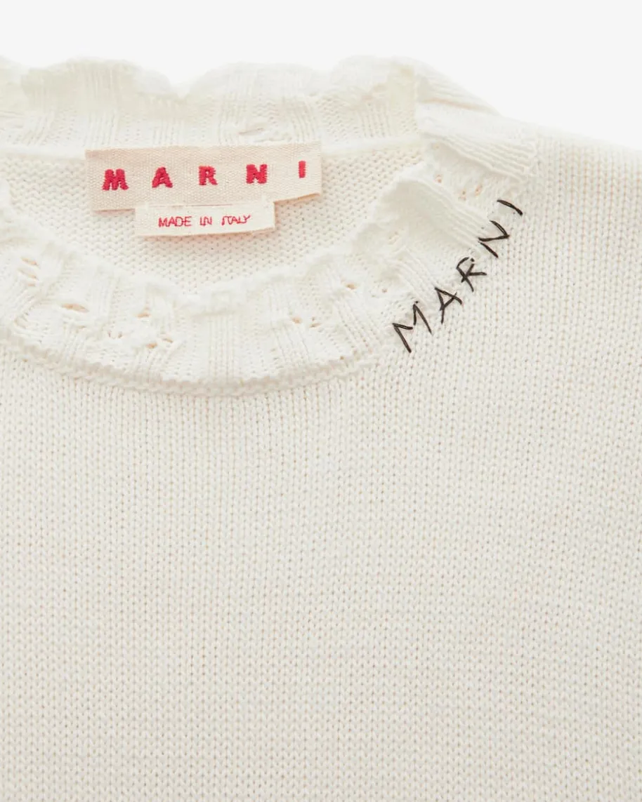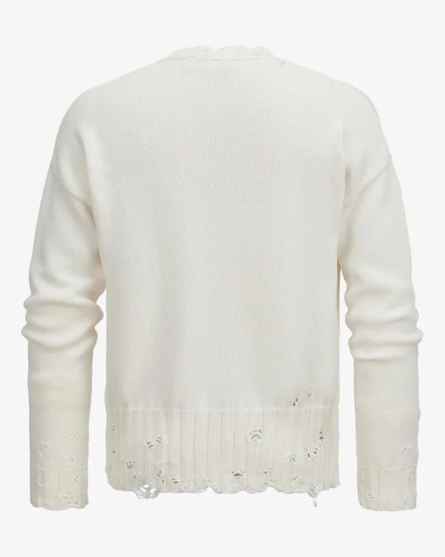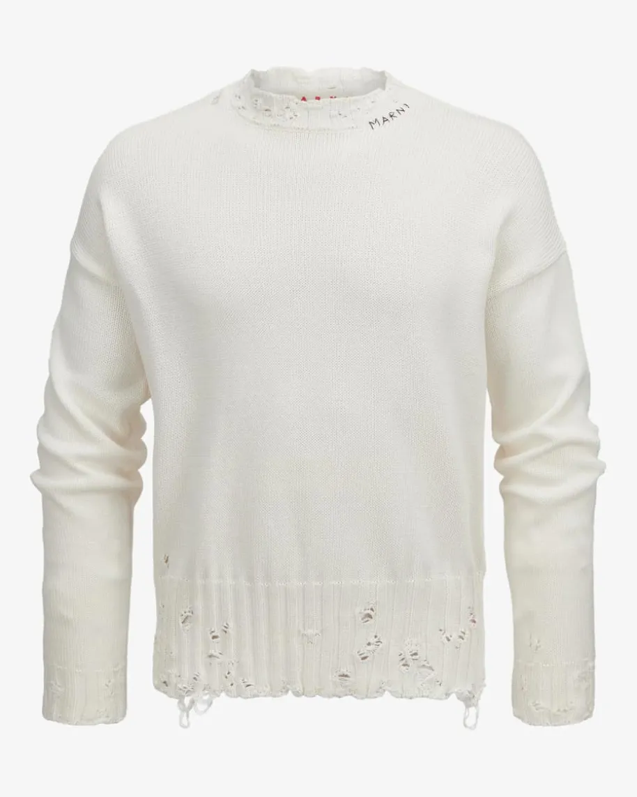 Pullover für Herren von Marni in Weiß. Das Modell präsentiert sich dank derhochwertigen schweren Baumwoll-Qualität mit angenehmem Tragekomfort. Dieraffinierten Used-Strickeffekte mit kleinen Löchern kreieren einen modischenBegleiter für stilvolle Outfits.
