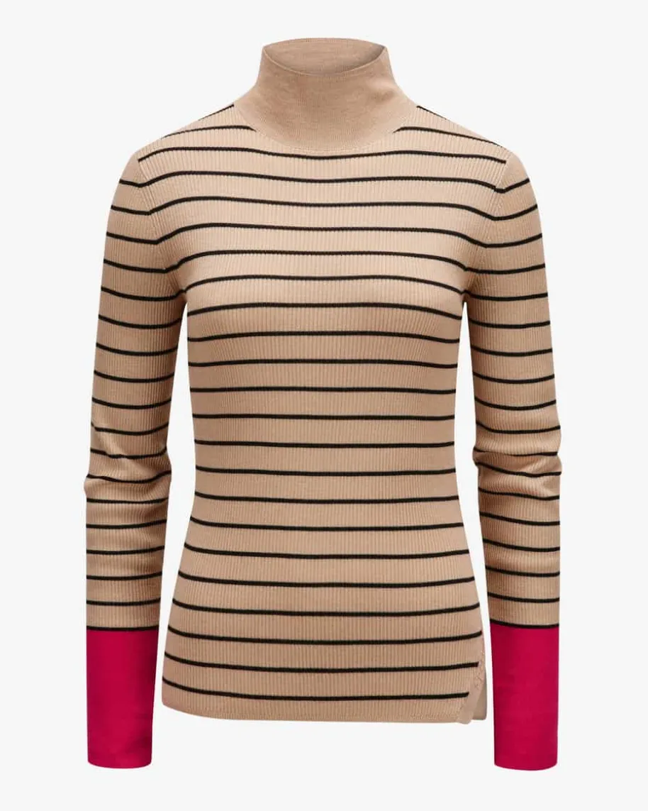Pullover für Damen von Sportalm Emotion in Sand, Schwarz und Rot. Für dasösterreichische Modelabel stehen exklusive Designs sowie höchsteQualitätsstandards im Fokus. Auch dieses Modell begeistert mit weicherFeinstrick-Verarbeitung aus leichter Wolle, der für angenehmen Tragekomfortsorgt. Die schmale Passform mit eingestricktem Streifenmuster undkontrastfarbenen Ärmelenden rundet den Look mit sportivem Touch.