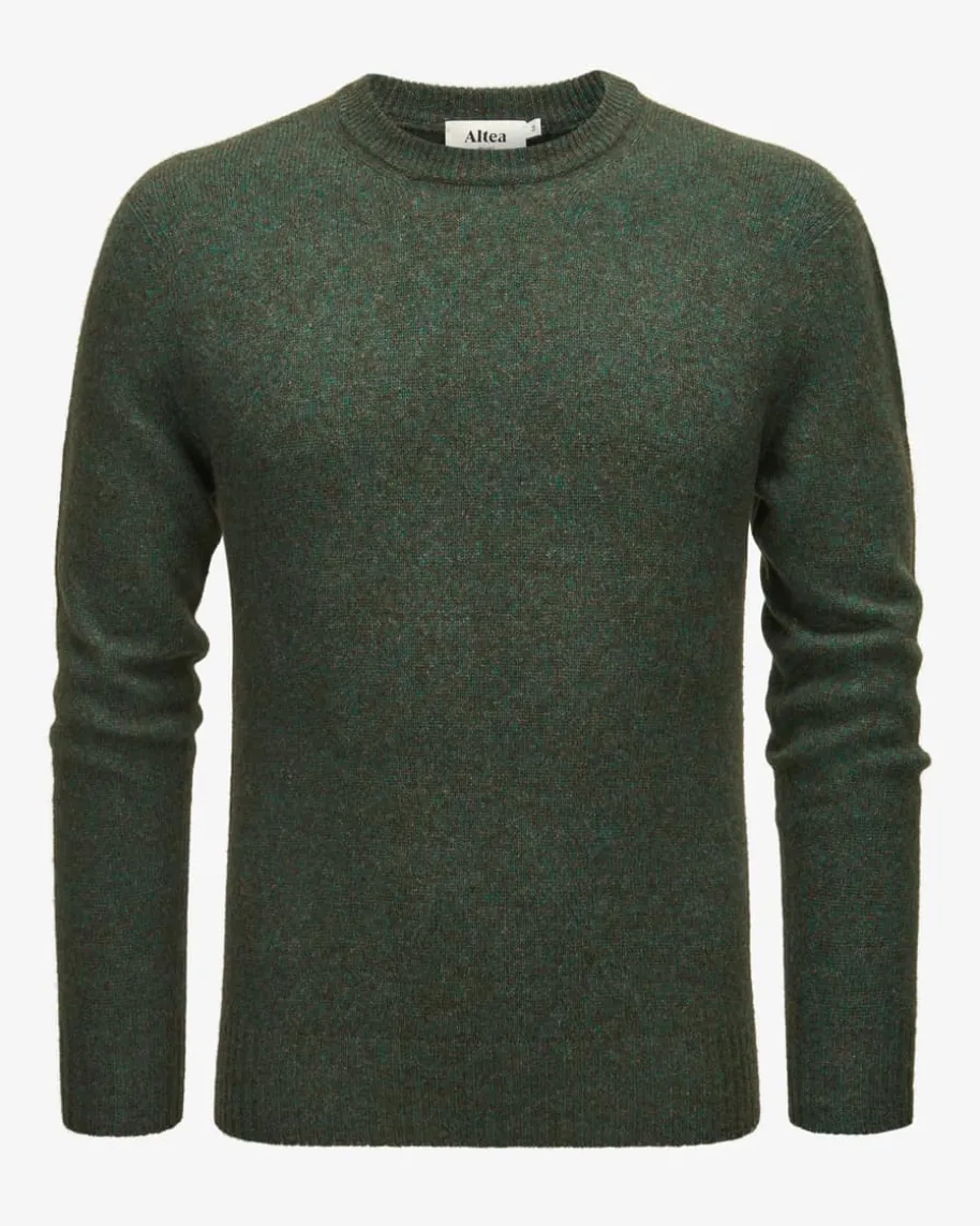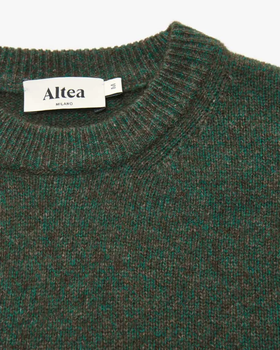 Pullover für Herren von Altea in Dunkelgrün und Braun. Made in Italy – DasModell in kontrastierender Melange-Optik besticht dank der Verwendung vonhochwertigem Woll-Mix mit Yak- und Cashmere-Anteil mit einem weichen Griff undleichter Strick-Haptik. Ein moderner Casual-Favorit für Ihre Herbst- und Winter-Garderobe.
