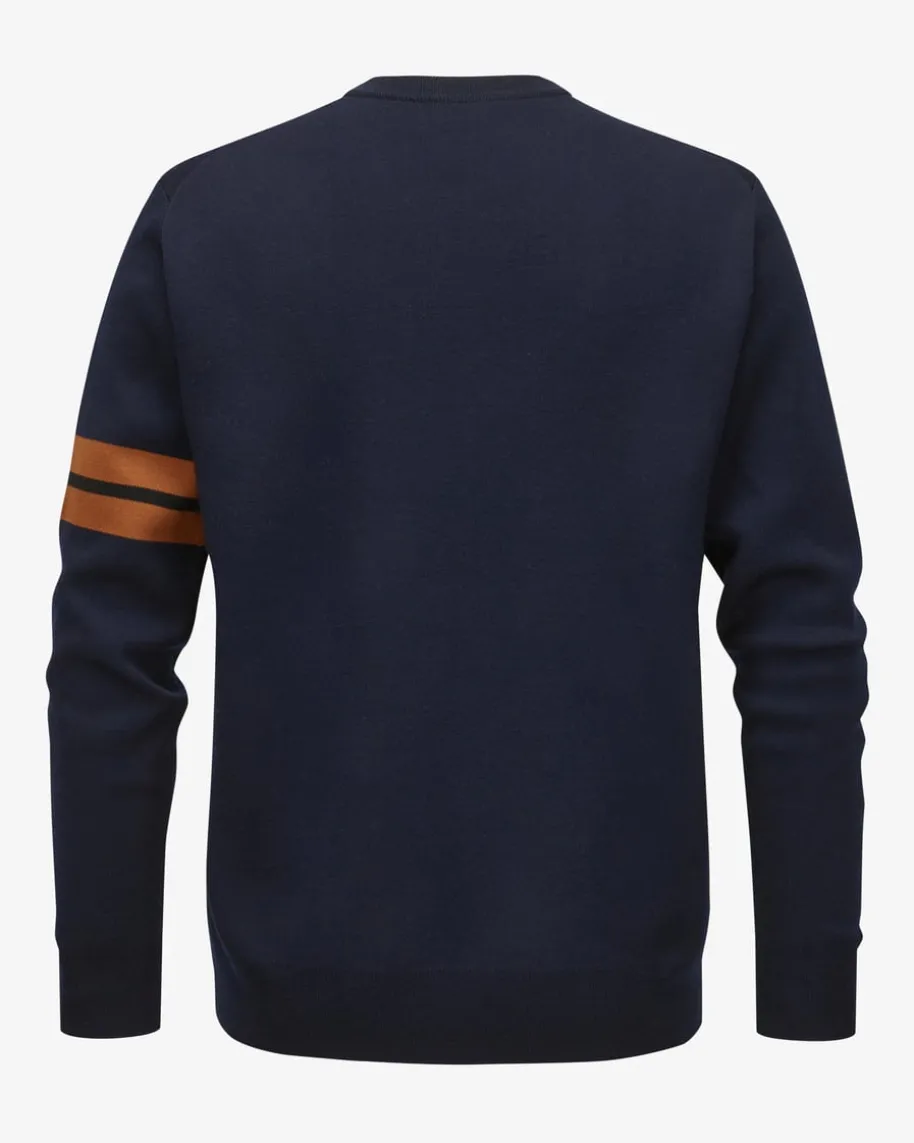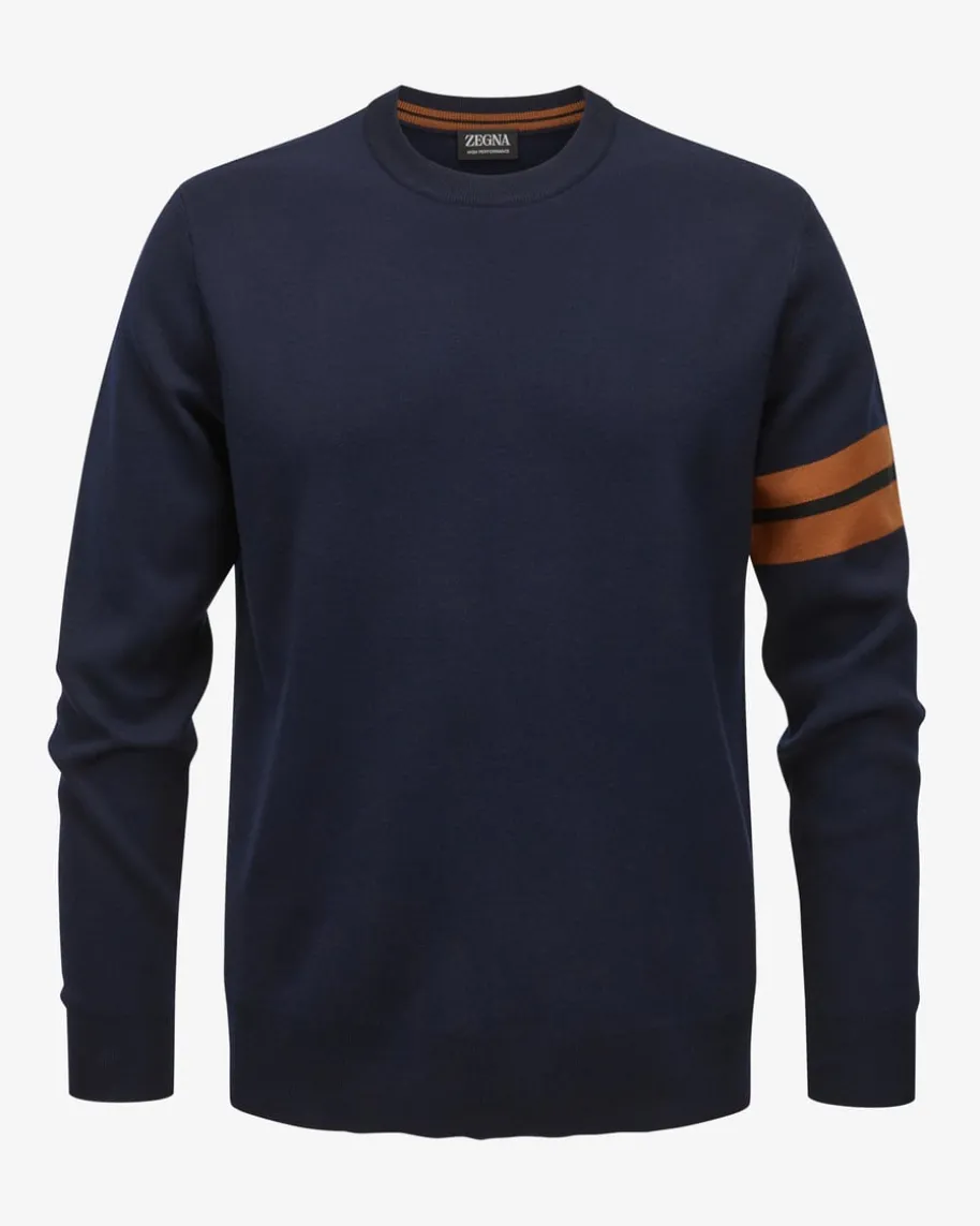 Pullover für Herren von Zegna in Navy und Terrakotta. Das Modell ausatmungsaktiver, strapazierfähiger High Performance-Merinowolle überzeugt imschlichten Design, während Kontraststreifen den Look sportiv in Szene setzen undso ein weiches Essential im Alpine Chic-Style kreieren.