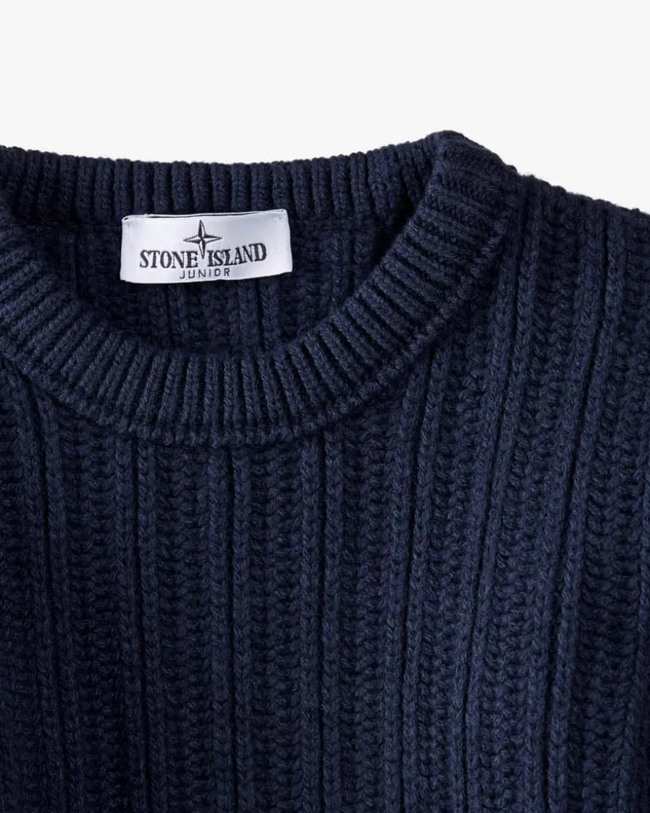 Pullover für Jungen von Stone Island Junior in Navy. Das Modell aus hochwertigemSchurwoll-Mix überzeugt mit schwerem Strick-Design, während die abnehmbare Logo-Plakette den Look charakteristisch abrundet.