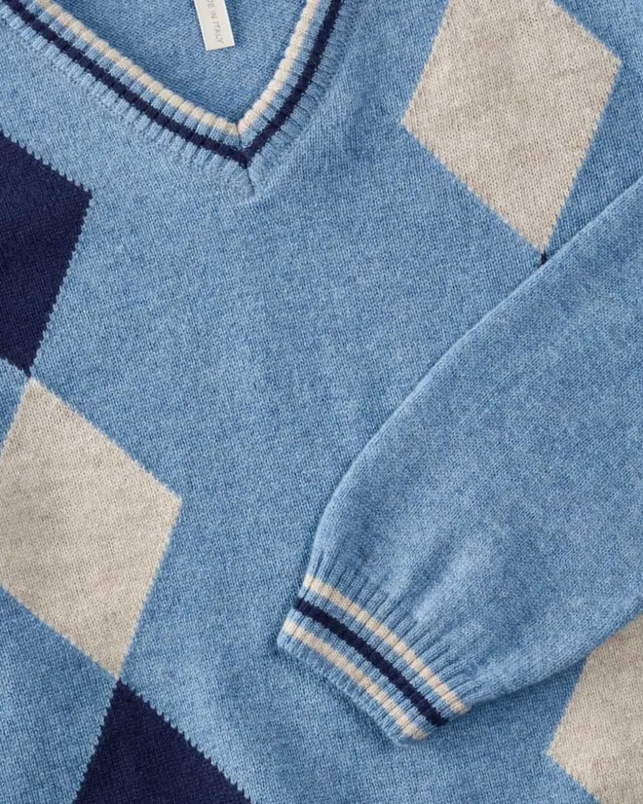 Pullover für Jungen von Maglificio di Verona in Blau, Navy und Sand. Das Modellüberzeugt dank stilvollen Rauten-Strick-Muster im Heritage-Look, während dieweiche Merinowolle angenehmen Tragekomfort garantiert.