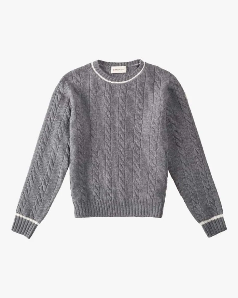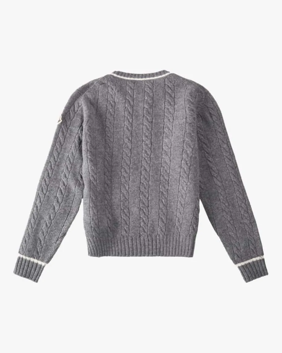 Pullover für Kinder von Moncler Enfant in Grau und Off-White. Dank derhochwertigen Schurwoll-Verarbeitung verspricht das Modell einen angenehmenTragekomfort, während die sportive Farbkombination sowie das klassischeZopfstrickmuster das Gesamtbild harmonisch vollenden.