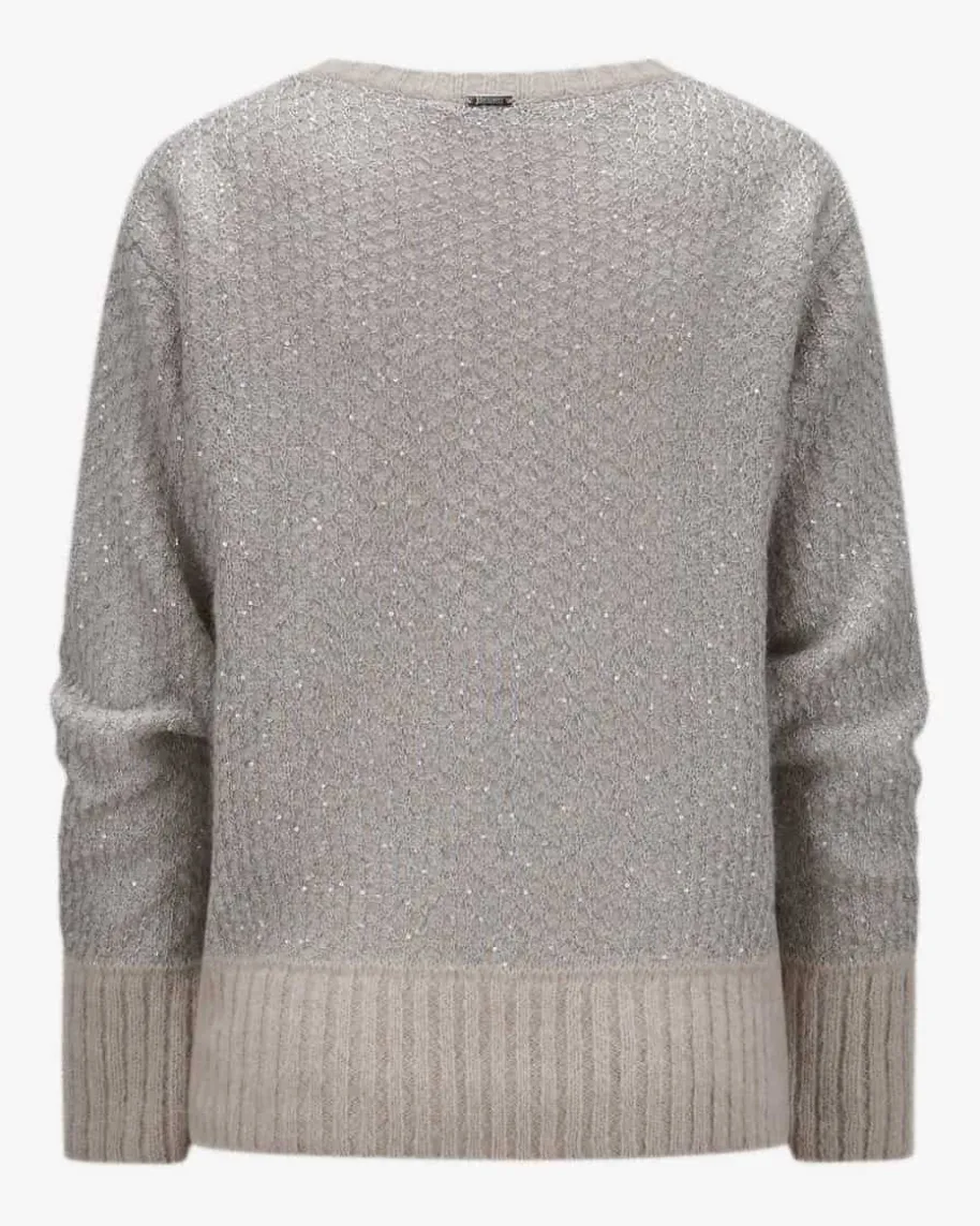 Pullover für Damen von Herno in Sand und Silber. Das Modell begeistert mit edelschimmernder Pailletten-Strick-Verarbeitung und legerer Passform mitüberschnittenen Schultern. – Ein Hingucker für modische Looks. Der hochwertigeAlpaka-Woll-Mix überzeugt mit besonders weichem Griff und rundet den Styleharmonisch ab.