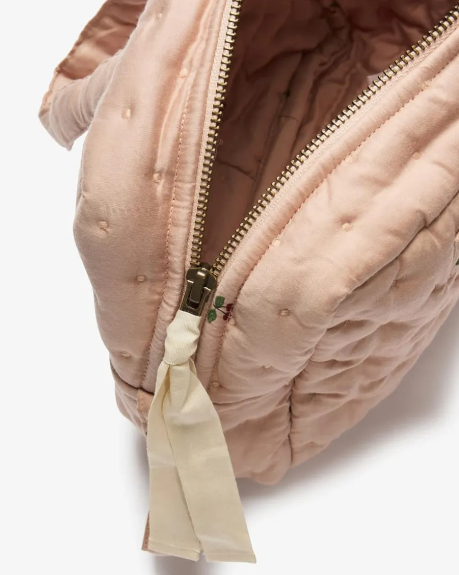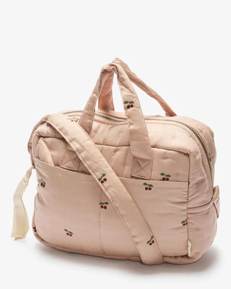Puppenwickeltasche für Kinder von Konges Slojd in Altrosa,Rot und Dunkelgrün. DasModell überzeugt durch das niedliche Dessin mit feinemKirschen-Print undpraktischen Taschen. Die weiche Material-Verarbeitung ausOekotex-zertifizierterBio-Baumwolle und recyceltem Polyester rundet das Designharmonisch ab.
