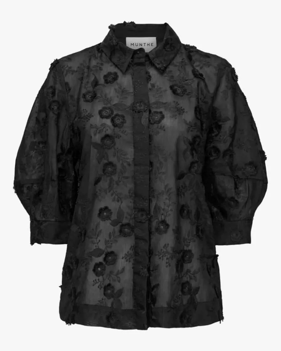 Pust Blusenshirt für Damen von Munthe in Schwarz. Das transparente Modellüberzeugt in klassischer Schnittform, während die florale 3-D Spitze dasGesamtbild harmonisch vollendet und einen modernen Begleiter für schicke Styleskreiert.