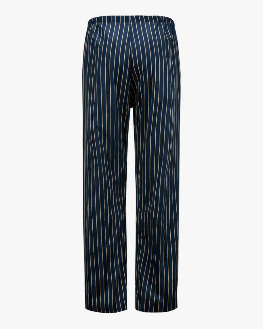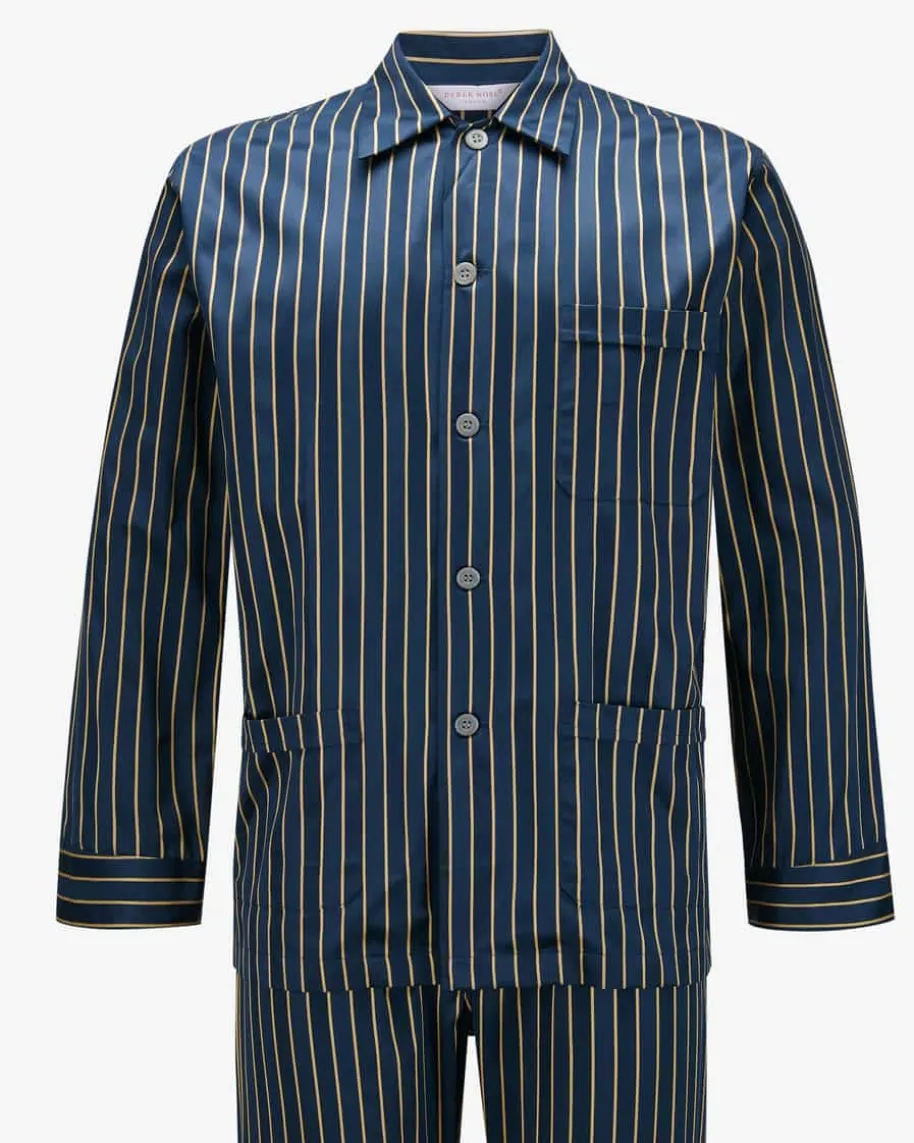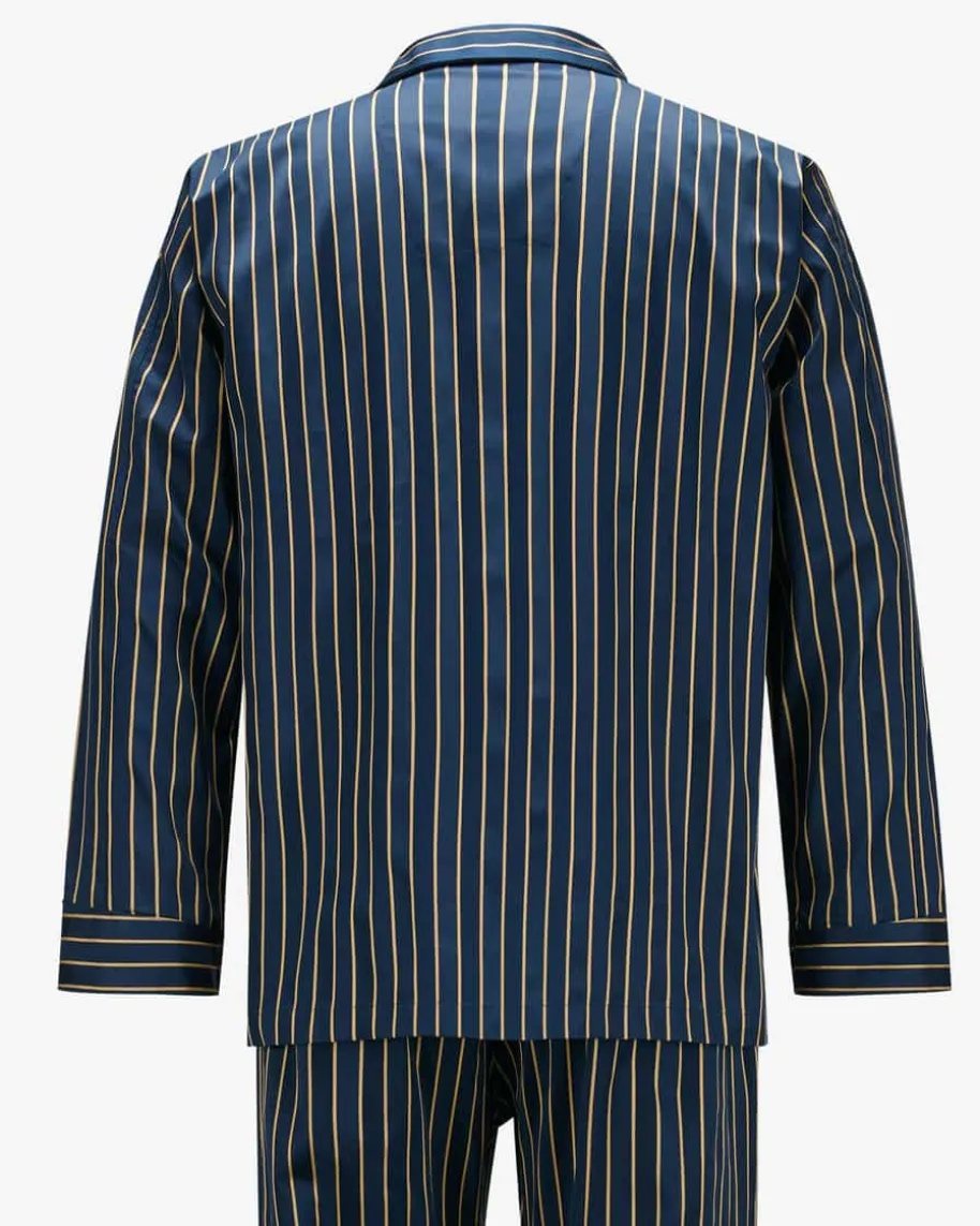 Pyjama für Herren von Derek Rose in Navy und Beige. Das Familienunternehmensteht für hochwertige Nachtwäsche und überzeugt mit exklusivem Komfort. DasLoungewear-Set verspricht dank der edel changierenden Baumwoll-Satin-Qualitätangenehme Wohlfühlmomente, während das zeitlose Streifen-Design für einen edlenLook sorgt.