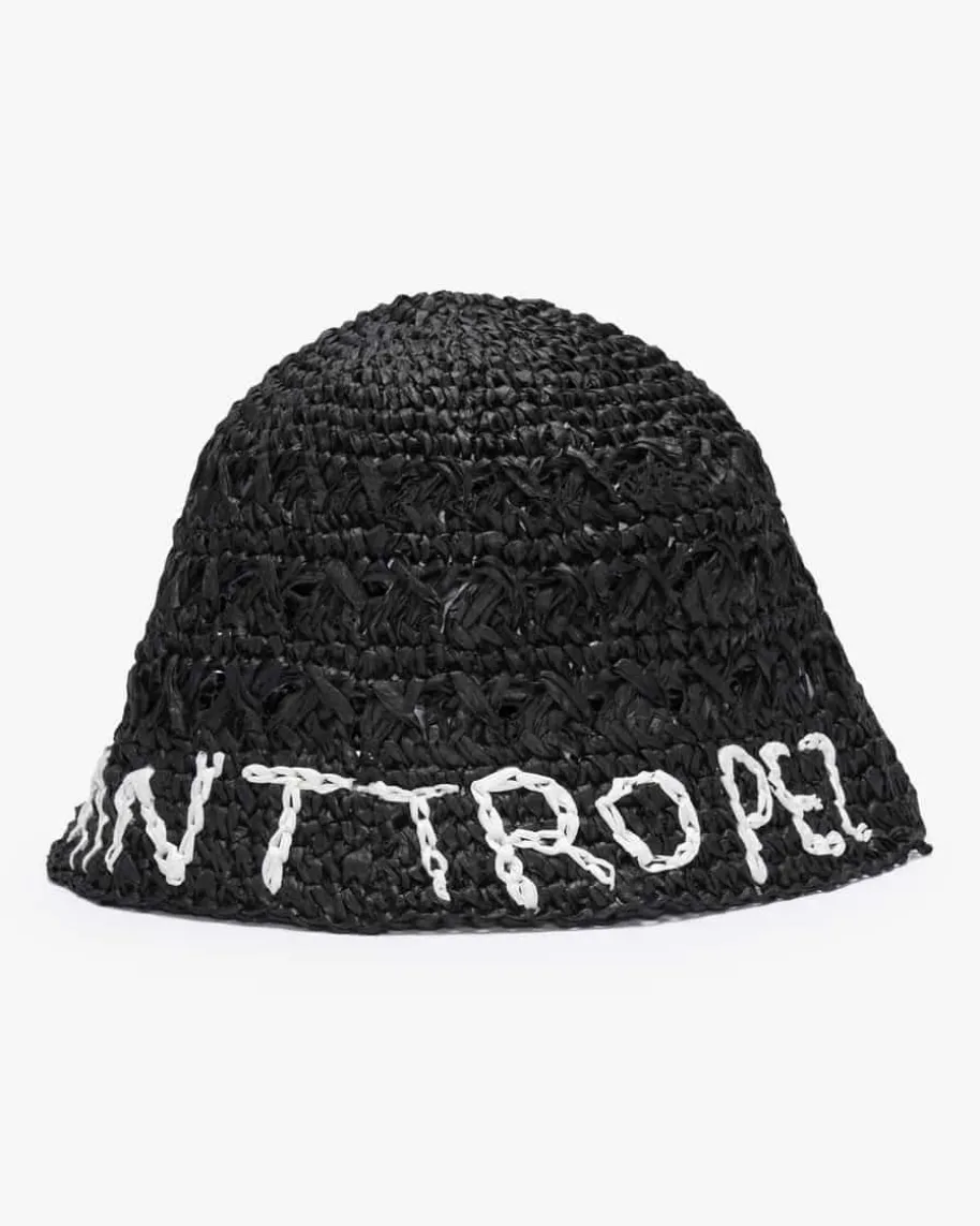 Saint Tropez Raffia Hut für Damen von De Siena in Schwarz und Weiß. Während diesommerliche Bast-Aufmachung im handgefertigten Design einen modischen Favoritenfür heiße Tage kreiert, fügt der auffällige Urlaubs-Schriftzug eine originelleNote hinzu.