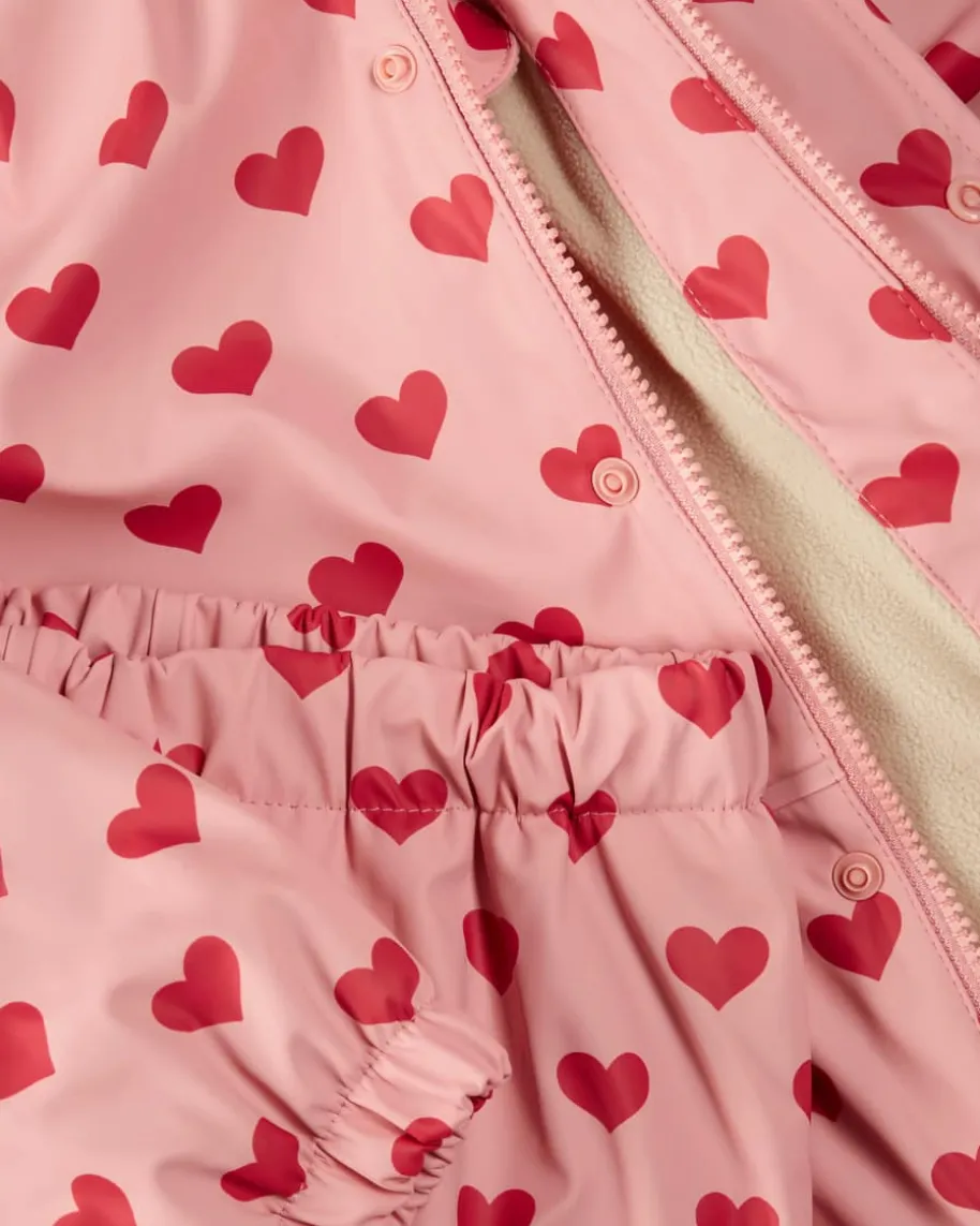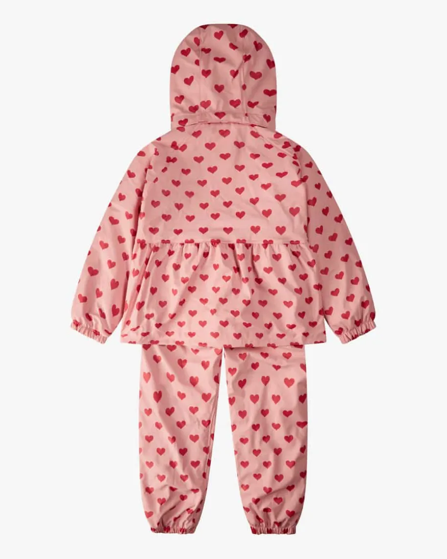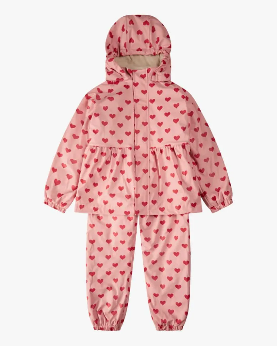 Rainy Palm Regenanzug für Mädchen von Konges Slojd in Rosa und Rot. Daszweiteilige Modell punktet mit niedlichem Herzmuster und ausgestellterSilhouette, während die wasserdichte Verarbeitung und die weiche Fleece-Innenseite für angenehmen Tragekomfort sorgen.