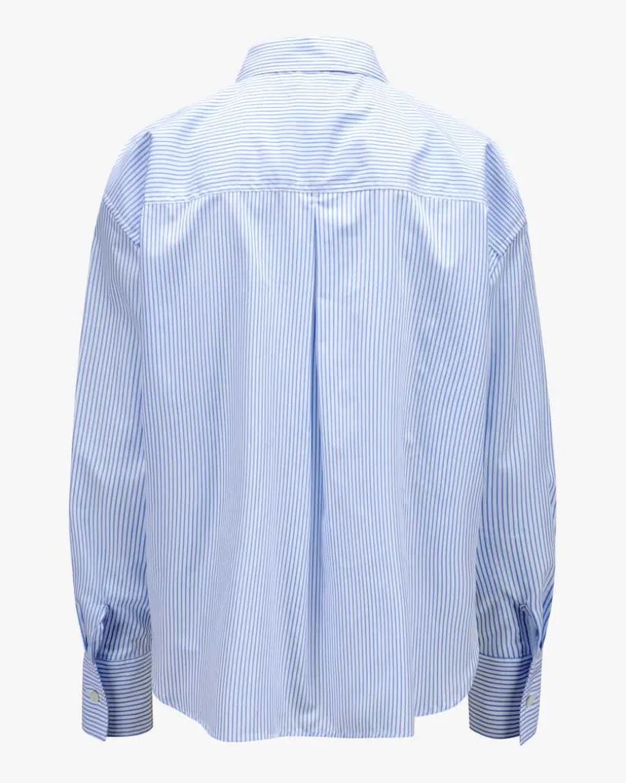 Renee Hemdbluse für Damen von Robert Friedman in Blau und Weiß. Das Modell inhochwertiger Baumwoll-Qualität überzeugt mit angenehmen Tragemomenten, währenddas Streifen-Dessin einen modernen Begleiter für vielseitige Styles schafft.