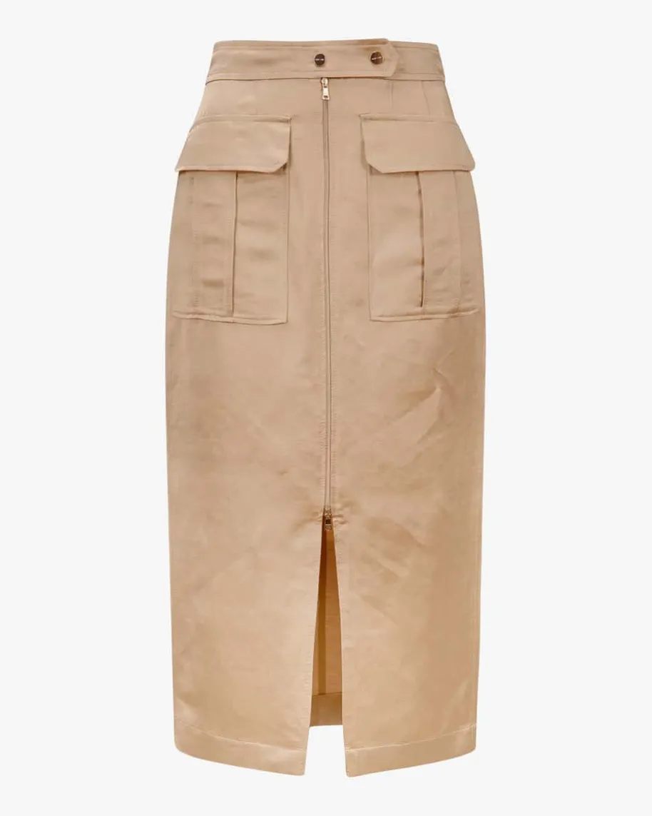 Rock für Damen von Marc Cain in Camel. Das Modell präsentiert sich in angenehmenViskose-Leinen-Baumwoll-Mix, während das changierende Dessin, gepaart mit derCargo-Aufmachung einen modernen Begleiter kreiert. In Kombination mit dempassenden Blazer schaffen sie einen stilsicheren Gesamtlook.