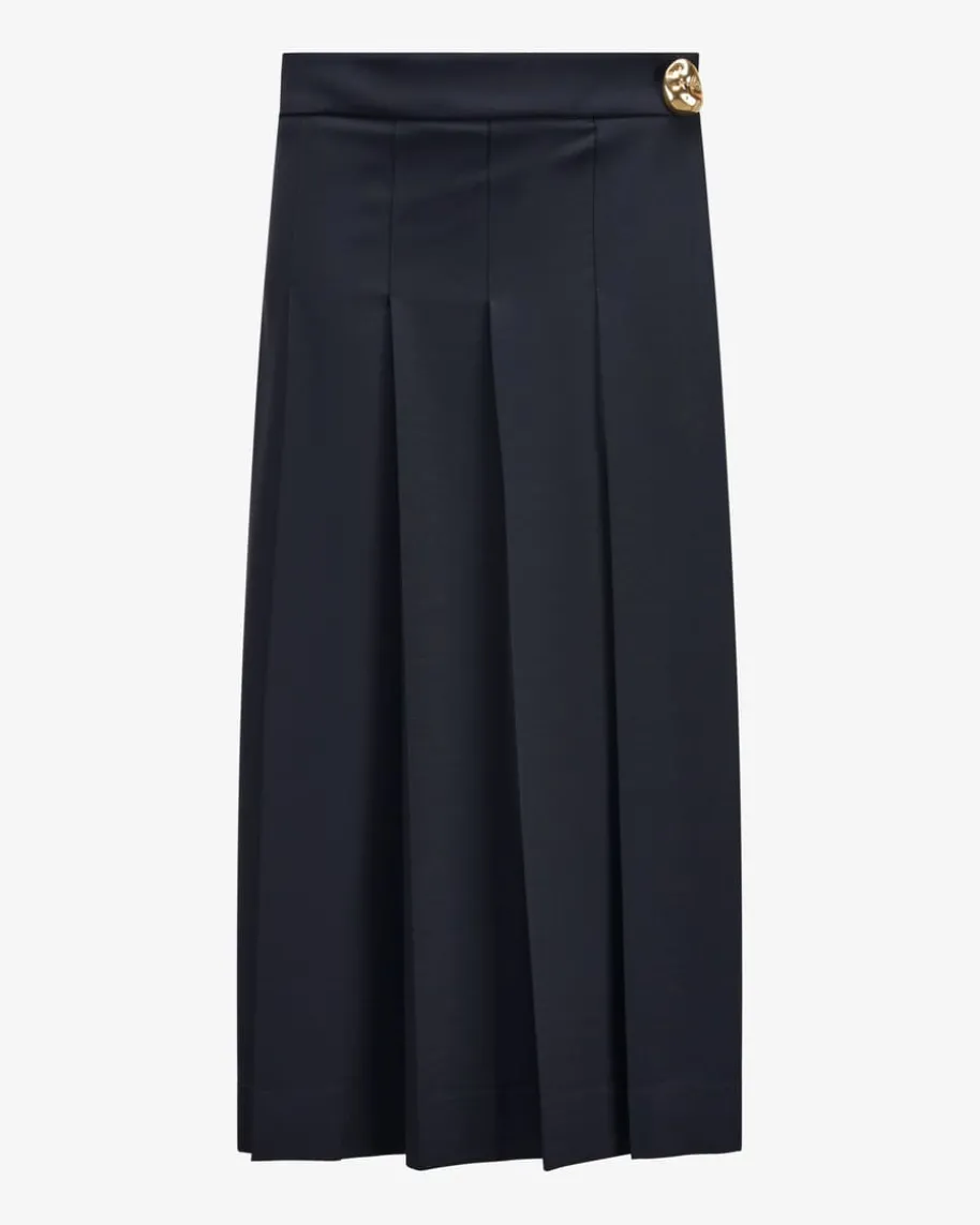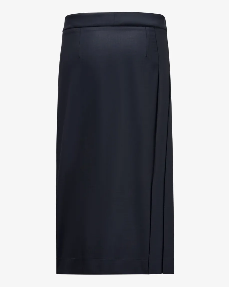 Rock für Damen von Fabiana Filippi in Navy. Das gerade geschnittene Modellpräsentiert sich im leichten Merinowoll-Mix mit origineller Faltenlegung undWickel-Technik, während das goldene Knopf-Detail einen edlen sowie femininenTouch verleiht.