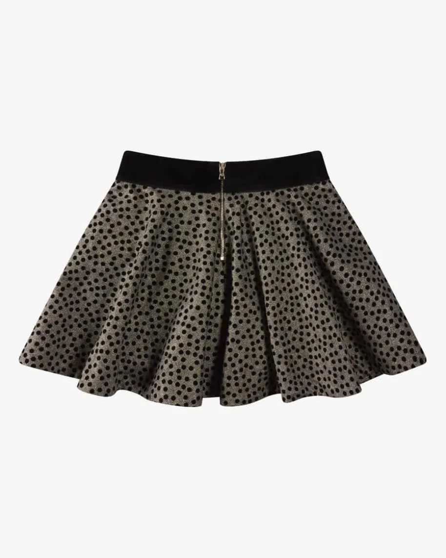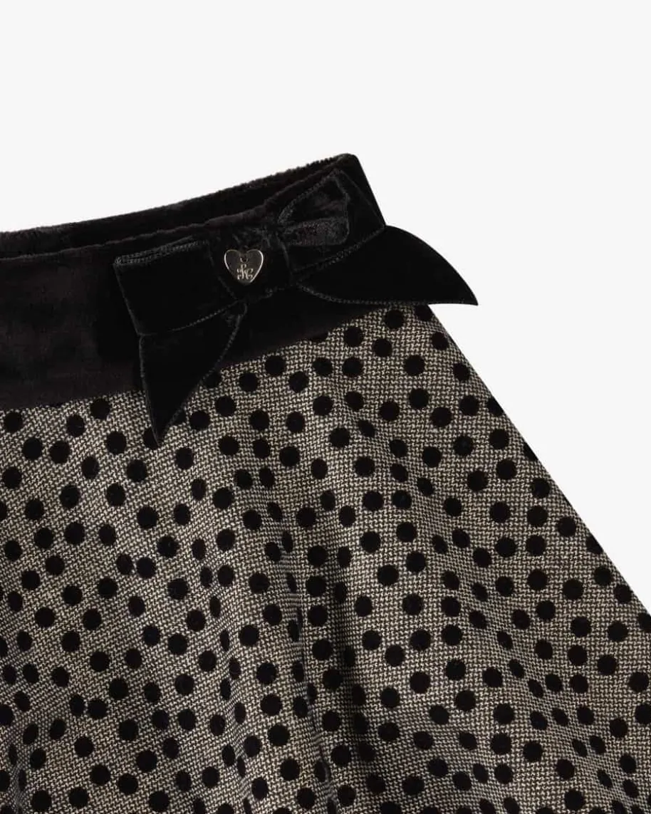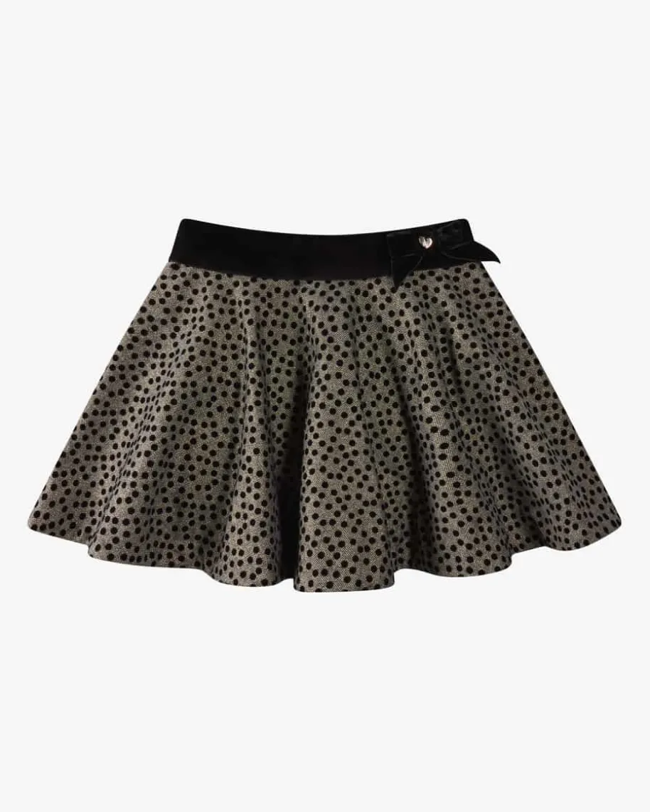 Rock für Mädchen von Tartine et Chocolat in Schwarz und Gold. Das Modell inschwingender Passform, überzeugt in Punkte-Dessin und goldfarbenen Fasern,während die Samt-Details den niedlichen Begleiter gekonnt abrunden.
