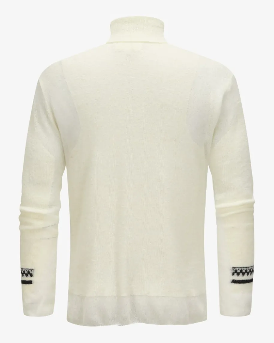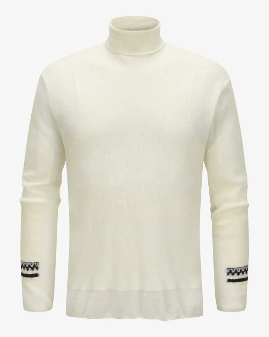 Rollkragenpullover für Herren von Mordecai in Creme. Das Modell aus hochwertigemWoll-Mix punktet dank des semitransparenten Strick-Designs in modernerAufmachung, welche durch das kleine Kontrast-Muster auf den Ärmeln einenbesonderen Touch erhält.