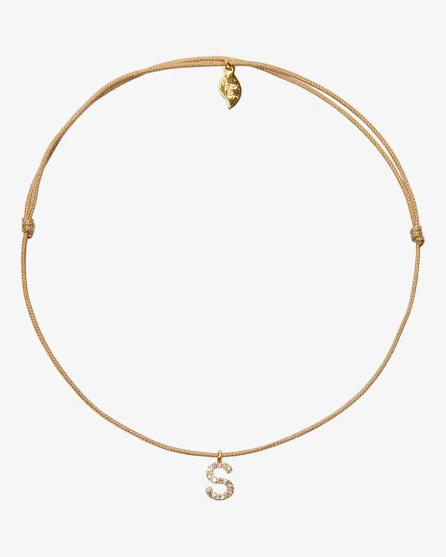 S-Glücksbändchen für Damen von Leaf in Beige und Gold. Das filigraneSchmuckstück besticht dank des diamantenbesetzten Anhängers aus Gold alsbesonderes Highlight, das sich perfekt für modische Lagen-Looks eignet.