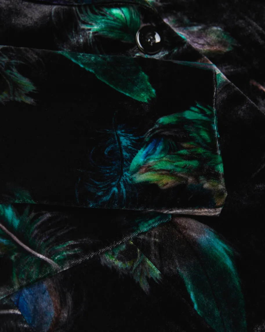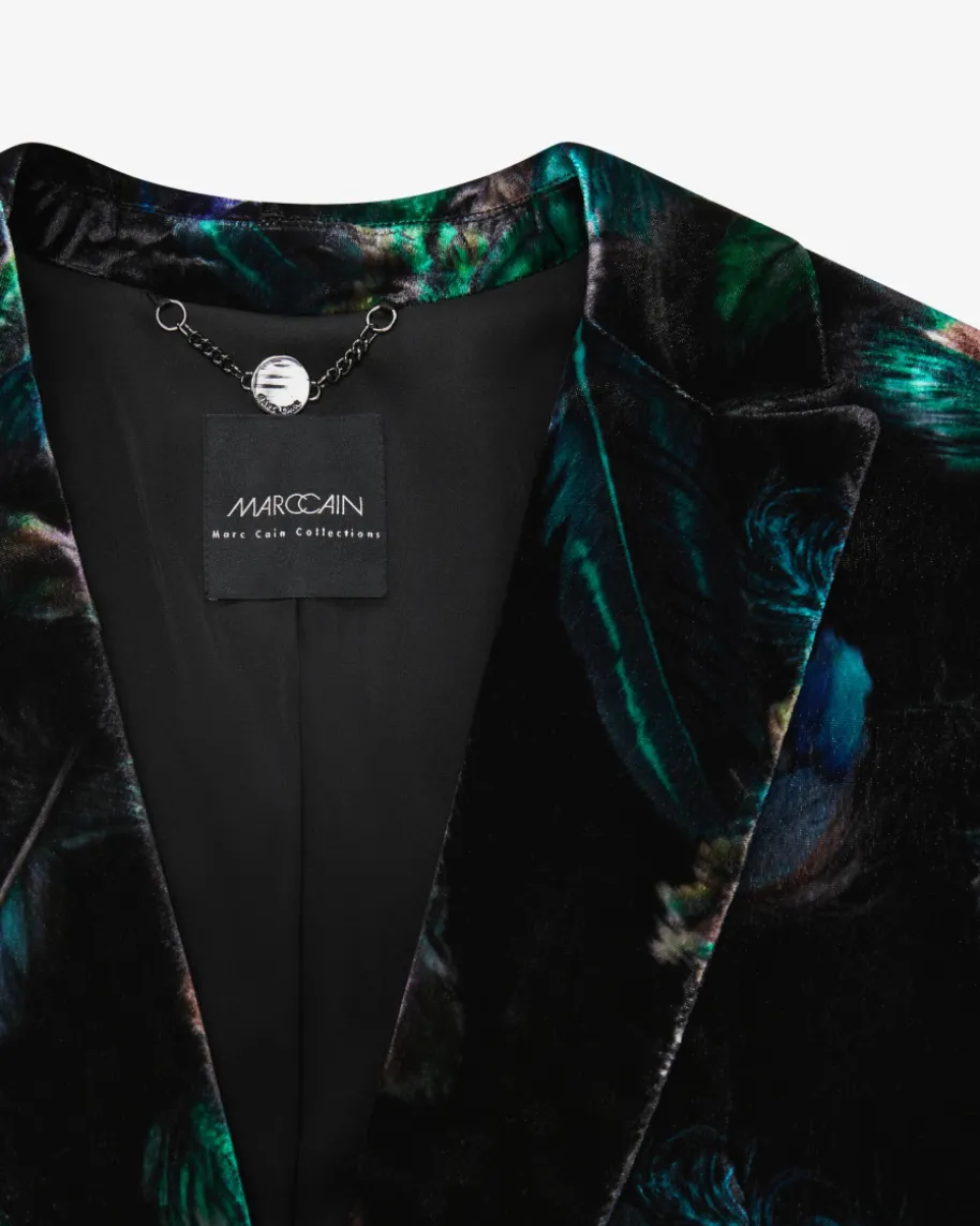 Samtblazer für Damen von Marc Cain in Schwarz, Grün und Blau. KombistarkeDesigns mit hohem Qualitätsanspruch – bekannt für Prints & Strick. Auch diesesModell in schlichter Schnittform überzeugt in weicher Samt-Aufmachung, währenddas Feder-Design den Gesamtlook feminin vollendet.