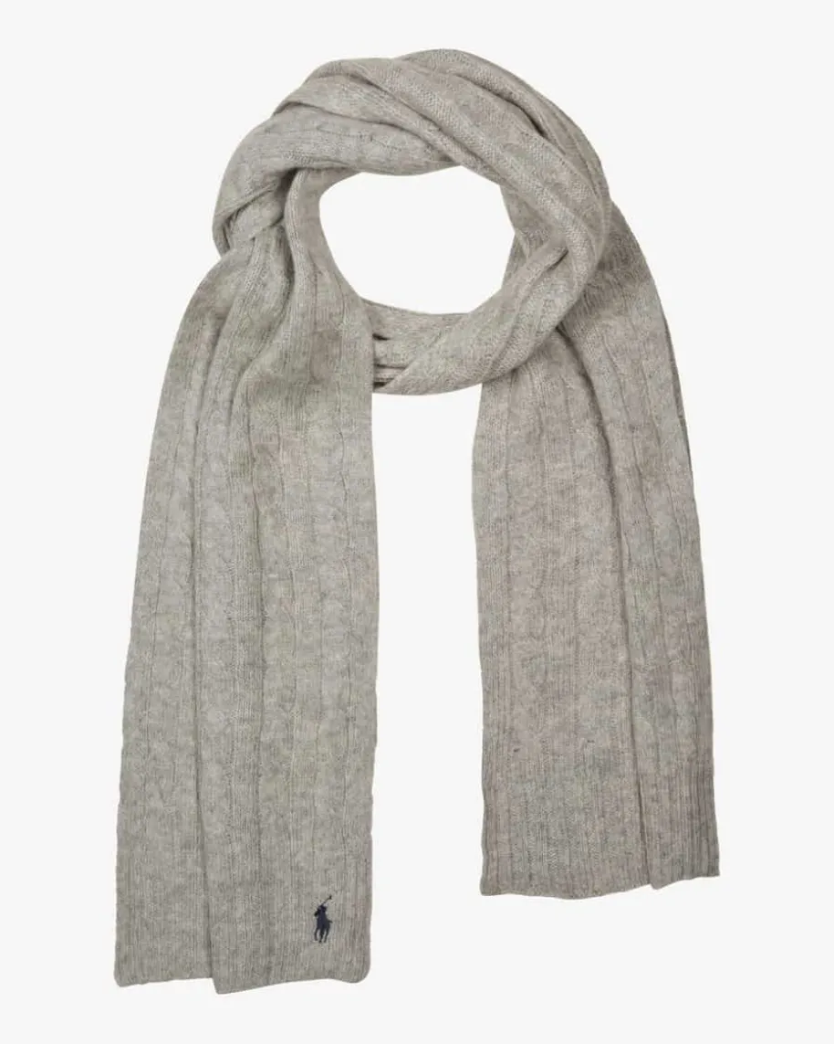 Strickschal für Damen von Polo Ralph Lauren in Grau. Das Modell präsentiert sichdank des hochwertigen Woll-Cashmere-Mix als weicher Favorit mit angenehm-leichtem Griff, während das Zopf-Design sowie Rippstrick-Details dem Gesamtbildeinen klassisch-modernen Charakter verleihen.