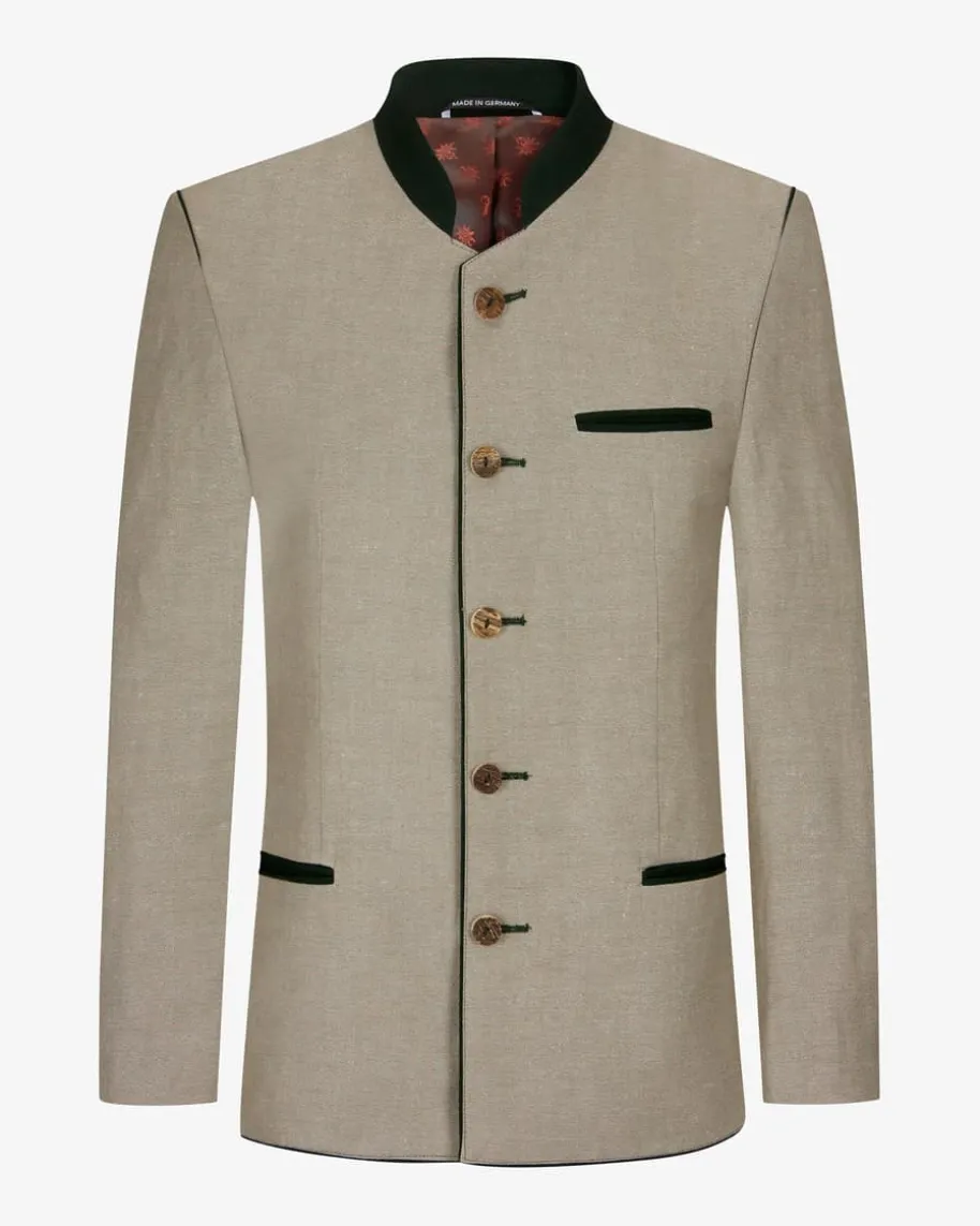 Trachten-Janker für Herren von Sandberg in Grün und Beige.Der exklusiv fürLODENFREY entworfene Janker aus hochwertigem Baumwoll-Leinen-Mix wird durchdunkelgrüne Paspeln an den drei Taschen, der Verschluss-Leiste und demStehkragen gekonnt in Szene gesetzt. Hornknöpfe aus edlemHirschhorn verleiheneine rustikale Note, während eine dezente Schulterwattierungsowie einerückseitige Kellerfalte die klassische Silhouette mit zweiInnentaschen undchangierendem Futter vollenden.