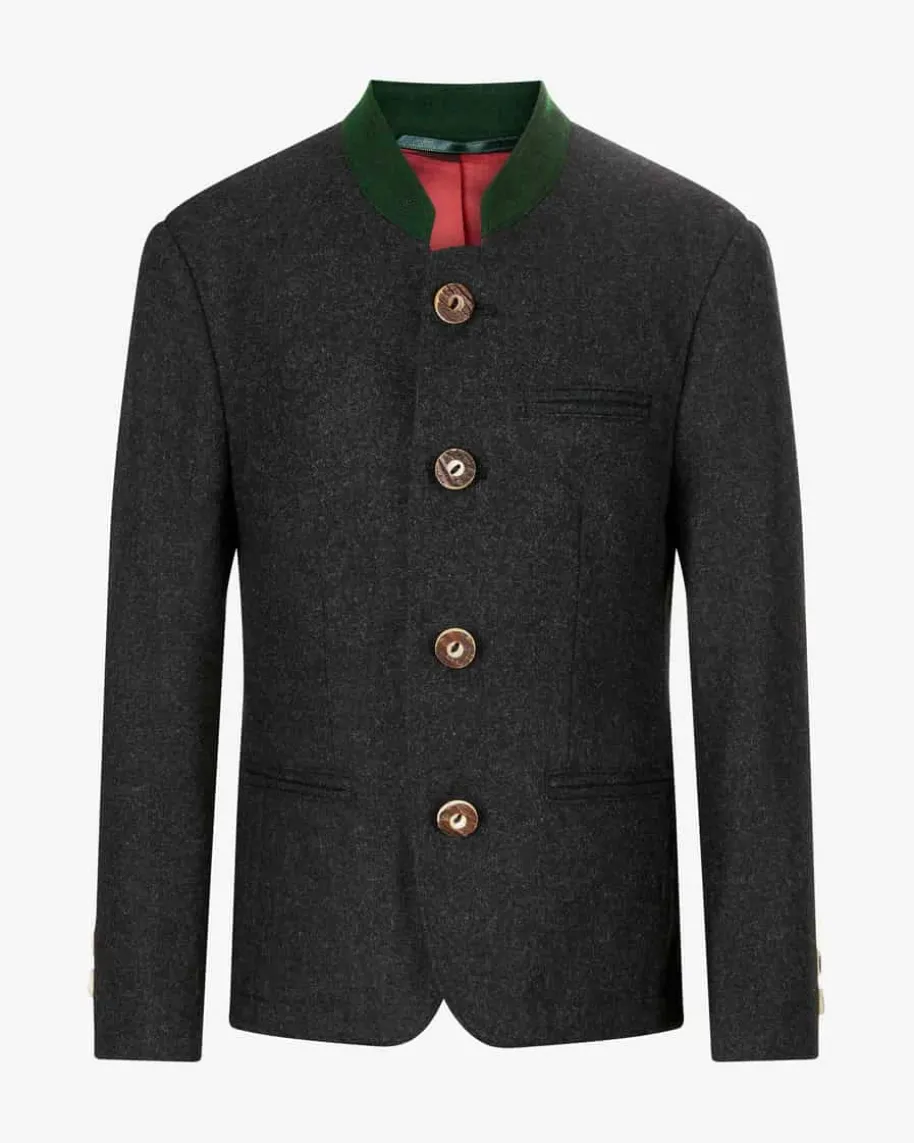 Schliersee Jungen-Trachtenjanker von LODENFREY in Anthrazit und Dunkelgrün. Madein Germany – Die kontrastierenden Paspeln sowie die rustikalen Hornknöpfeverliehen dem Modell den traditionellen Charakter, welcher durch die feingewebte Leinen-Baumwoll-Qualität edel ergänzt wird.