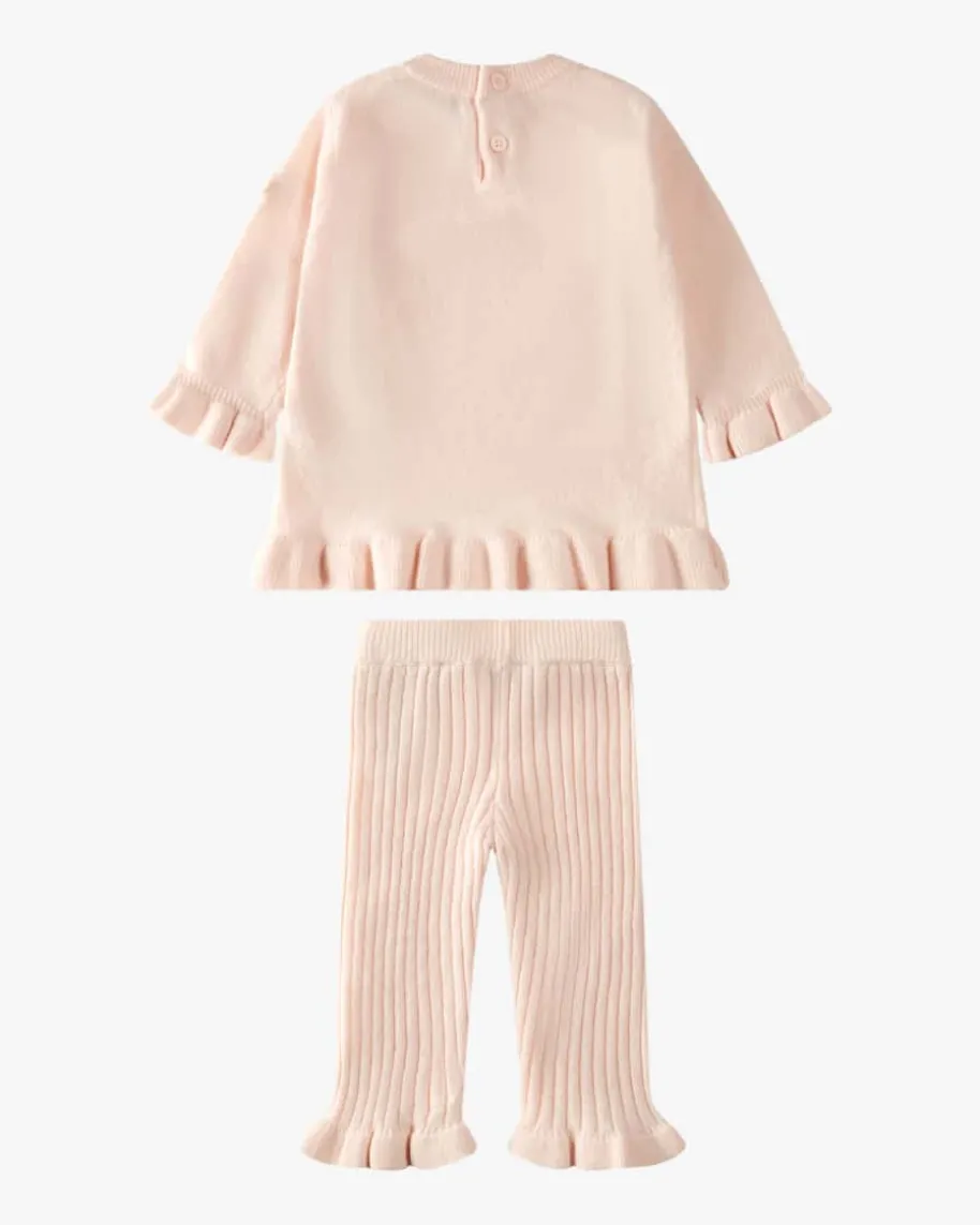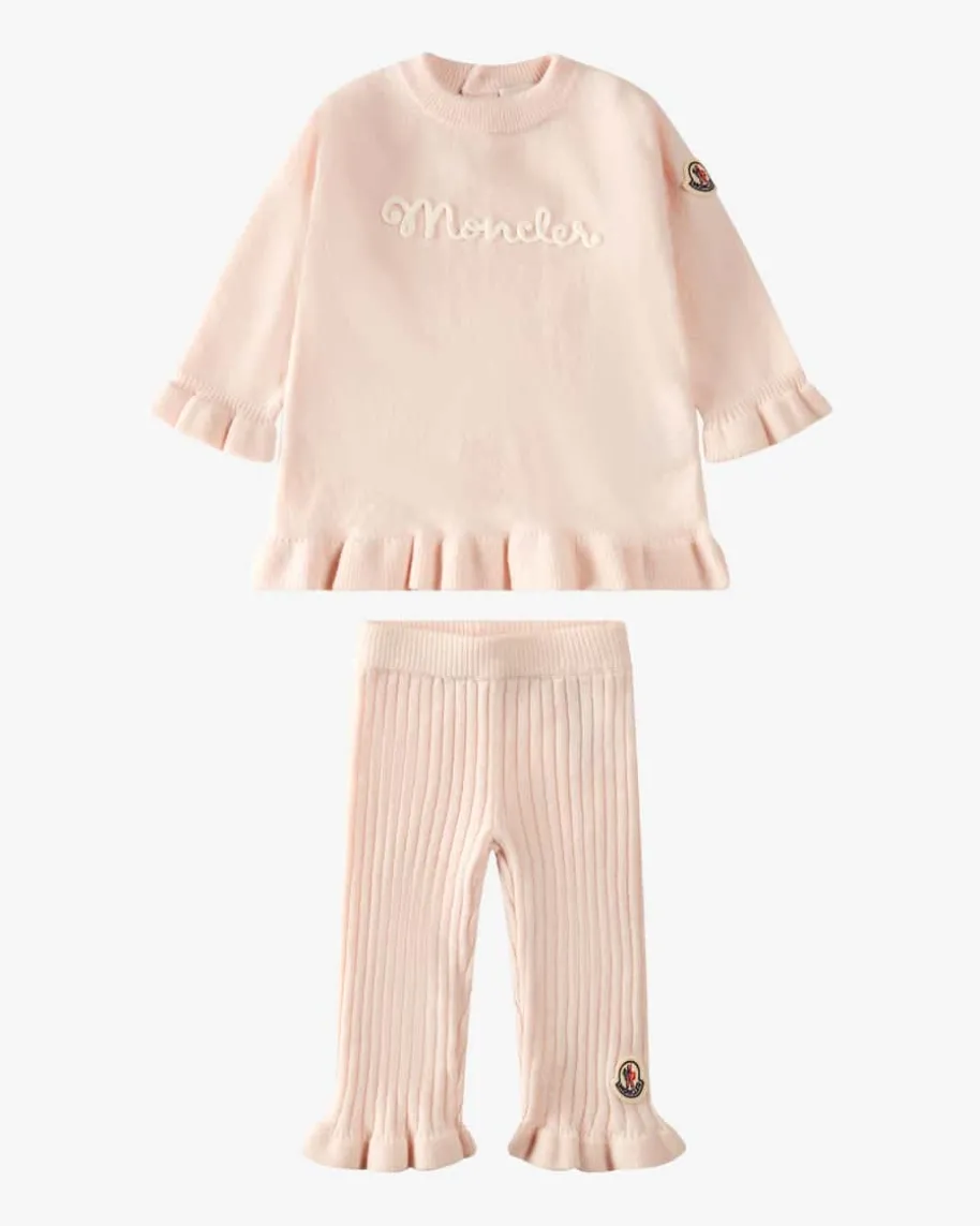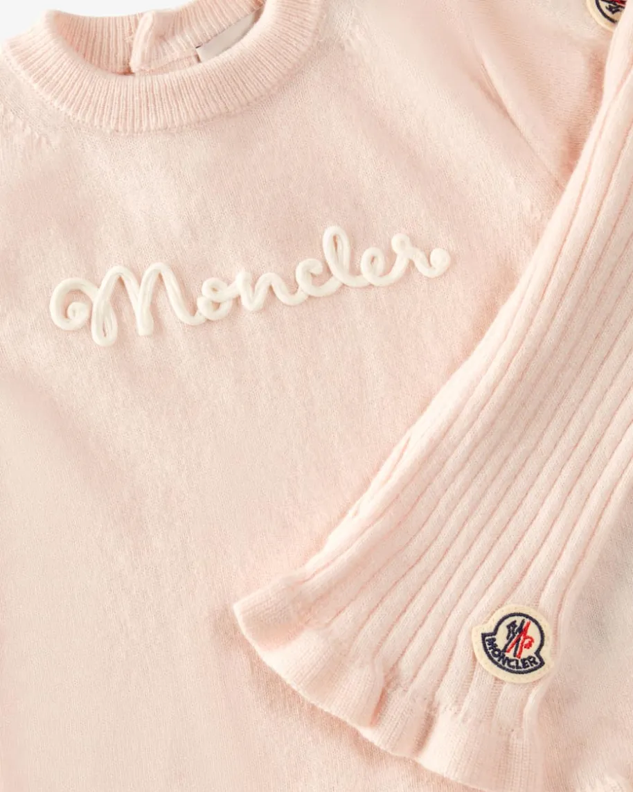 Zweiteiler für Babys von Moncler Enfant in Rosa. Das Modell überzeugt dankhochwertiger Schurwoll-Cashmere-Qualität, während die geknöpfte Rückseite einAn- und Ausziehen erleichtert und die niedlichen Bündchen in Rüschen-Aufmachungdas Gesamtbild harmonisch abrunden.