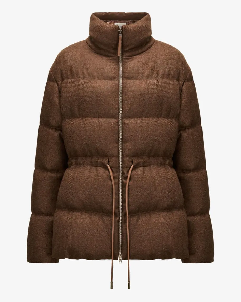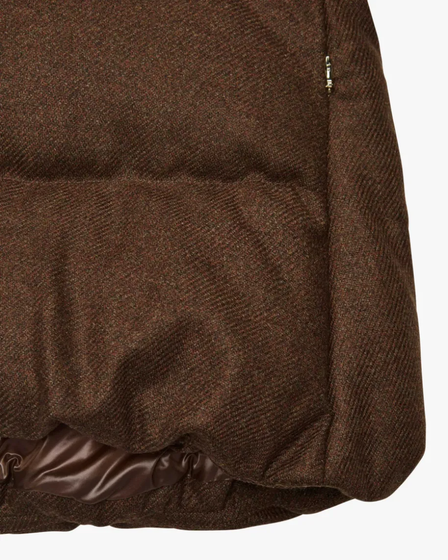 Schurwoll-Seiden-Daunenjacke für Damen von Herno in Kastanie. Die italienischeMarke kombiniert Funktionalität mit Luxus – insbesondere im Bereich hochwertigerJacken und Mäntel. Auch dieses Modell punktet als Favorit an kühlen Tagen dankder hochwertigen Daunen-Feder-Füllung, während die stilvoll melierte Optik unddie Kalbsleder-Details das Gesamtbild mit dezenten Country-Vibes abrunden.