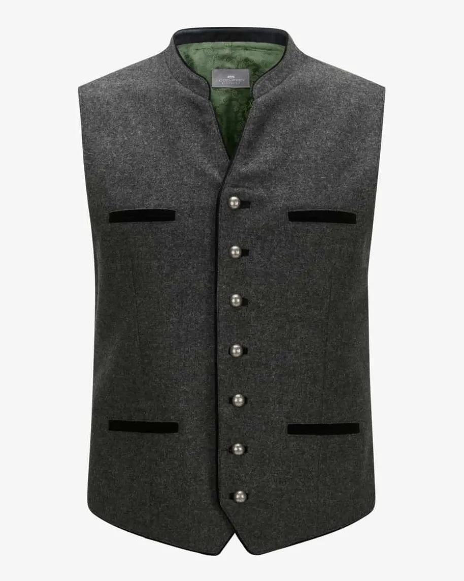 Schwabing Trachtenweste für Herren von LODENFREY in Grau. Die Herren-WesteModell Schwabing ist aus hochwertiger Schurwolle gefertigt und versprichtangenehme Tragemomente. Ornamentale Kugelknöpfe und kontrastierendePaspeltaschen runden die traditionelle Weste gekonnt ab. Ideal zur Lederhose undHaferschuhen.