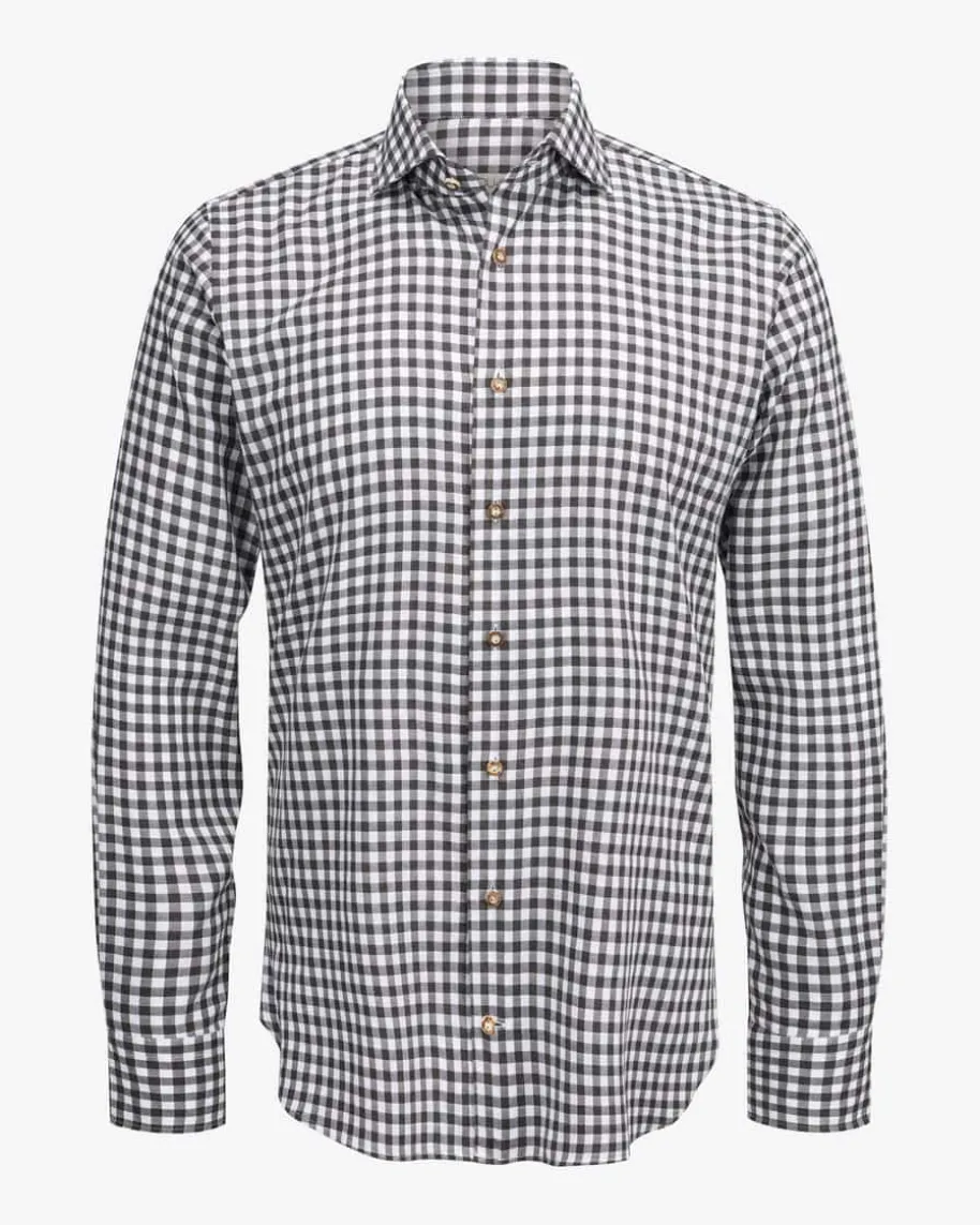 Sebi Trachtenhemd für Herren von Du4 in Schwarz und Weiß. Seit 45 Jahrenentwirft das Label leidenschaftlich stilvolle Hemden – Das taillierte Modell ausangenehmer Baumwoll-Verarbeitung überzeugt durch die traditionelle Optik sowiedas markante Vichy-Karo-Muster, während die Hornknöpfe besondere Akzente setzen.