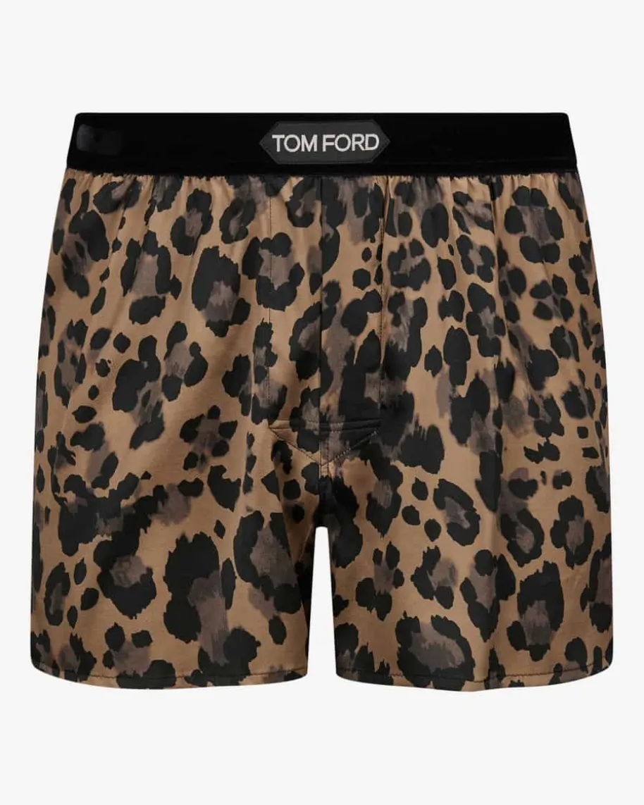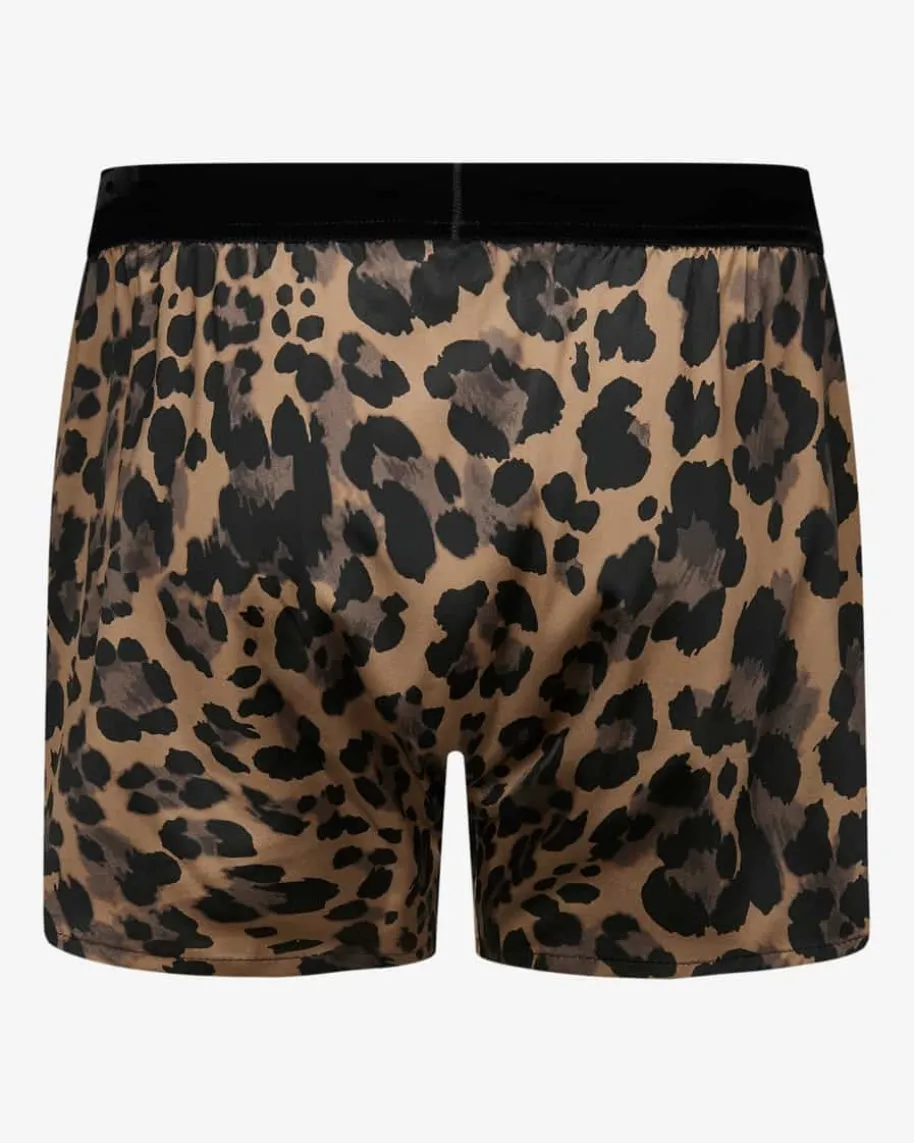Seiden-Boxershorts für Herren von Tom Ford in Hellbraun und Schwarz. Dieelastische Seiden-Qualität sorgt für einen hochwertigen Look, während diechangierende Verarbeitung in Kombination mit dem Samt-Bund das edle Leoparden-Design gekonnt vollendet.