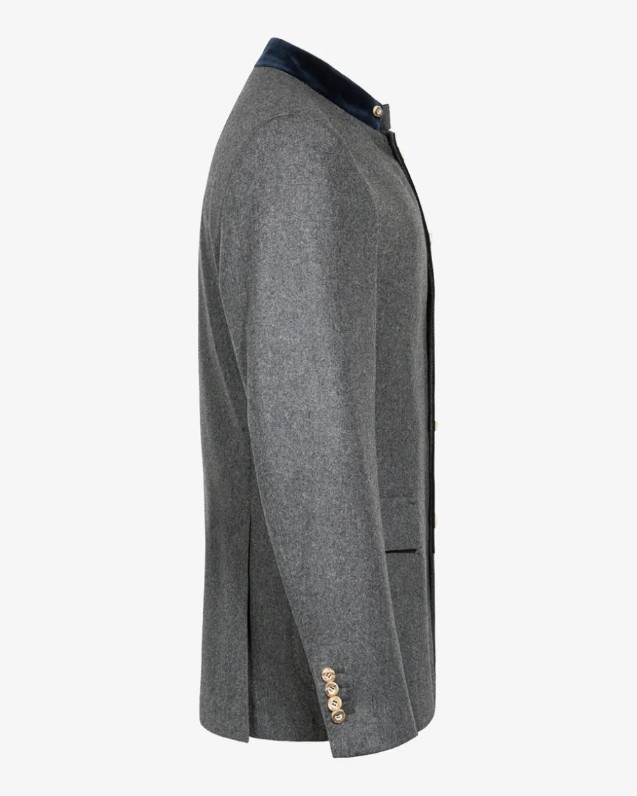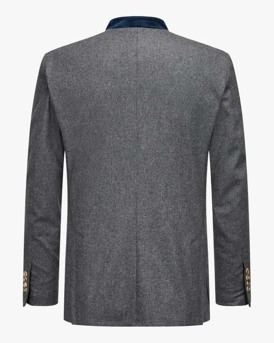 Sendling Trachten-Janker für Herren von Windsor in Hellgrau und Dunkelblau. Dastraditionell inspirierte Modell aus italienischem Wolltuch überzeugt durchraffinierte Details wie edle Samt-Elemente oder echte Hirschhorn-Knöpfe. Dieideale Ergänzung zum Trachtenlook!