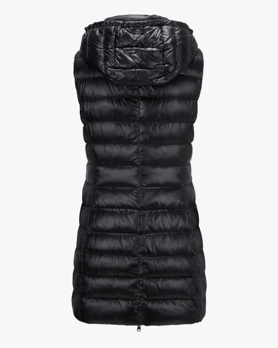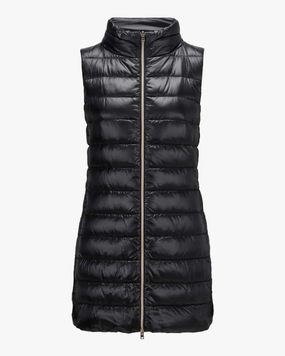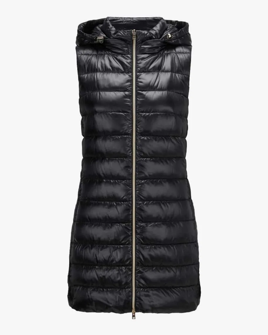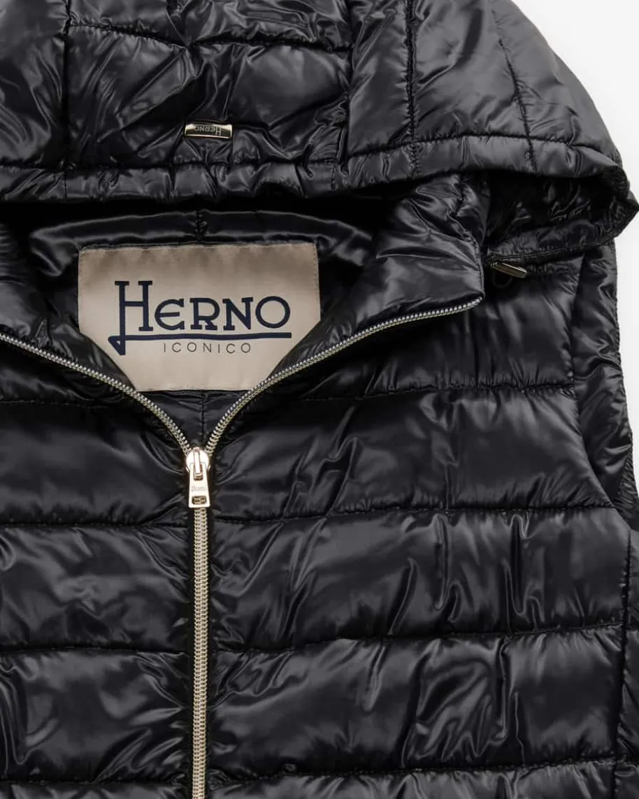 Serena Daunenweste für Damen von Herno in Schwarz. Das italienische PremiumLabel ist seit Jahren bekannt für seine besonders leichten Daunenjacken, die mitzeitlos-sportiven Designs überzeugen. Auch dieses verlängerte Modell überzeugtdurch seine besonders leichte Material-Verarbeitung in changierender Stepp-Optik, während die taillierte Passform Ihre Figur feminin in Szene setzt.