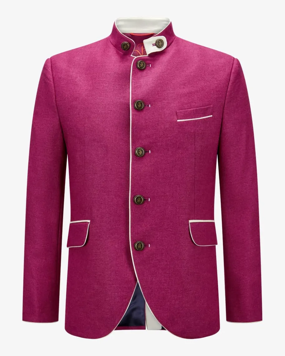 Silas Trachten-Janker für Herren von Frederic Meisner in Magenta und Creme. DasModell besticht dank der hochwertigen und zugleich leichten Schurwoll-Mixes intraditioneller Aufmachung. Edle Metallknöpfe mit Initialen des Labels sowieKontrast-Paspeln runden das maskuline Trachten-Outfit perfekt ab.